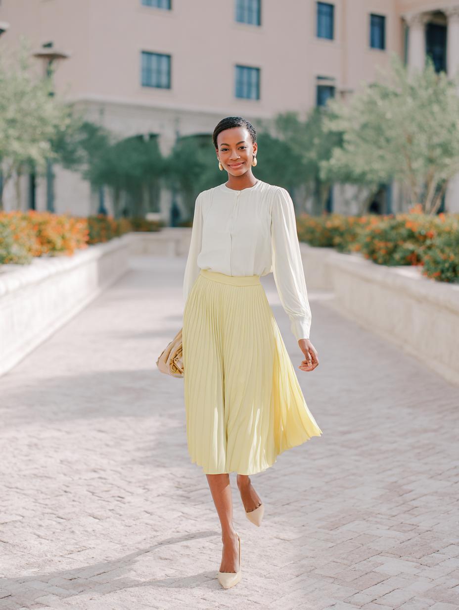 This sophisticated outfit proves that covering your arms doesn’t mean sacrificing style. The butter yellow wrap blouse offers full arm coverage while the tie-front detail creates a flattering silhouette that defines the waist. Paired with high-waisted wide-leg trousers in a neutral tone, this look is both professional and polished. The monochromatic neutral palette with the pop of sunny yellow feels fresh and modern, while the flowing fabrics ensure comfort throughout the day. Complete the look with classic accessories for an ensemble that’s perfect for the office, lunch dates, or any occasion where you want to look put-together without trying too hard.