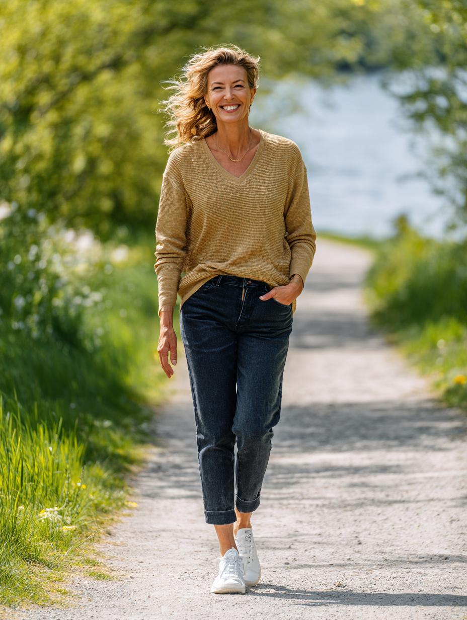 This timeless combination proves that covering your arms doesn’t mean sacrificing style. The relaxed v-neck sweater provides comfortable coverage while the flattering neckline keeps the look feminine and fresh. Paired with cropped straight-leg jeans and crisp white sneakers, this outfit strikes the perfect balance between polished and casual – ideal for weekend errands, coffee dates, or leisurely neighborhood strolls. The neutral color palette and classic silhouettes create a sophisticated foundation that works beautifully for women over 40.
