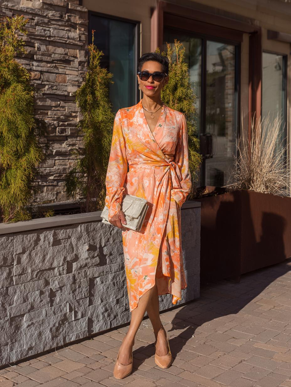 This gorgeous wrap-style midi dress proves that arm coverage can be incredibly chic and feminine. The flowing long sleeves provide elegant coverage while the wrap silhouette creates a flattering waistline that’s universally flattering for women over 40. The vibrant floral print in warm sunset tones adds a youthful, fresh energy to the look, while the midi length keeps it sophisticated and age-appropriate. The silky fabric drapes beautifully without clinging, and the wrap design allows you to adjust the fit to your comfort level. Paired with nude pumps and classic sunglasses, this outfit strikes the perfect balance between coverage and style – proving you don’t need to sacrifice elegance for comfort.