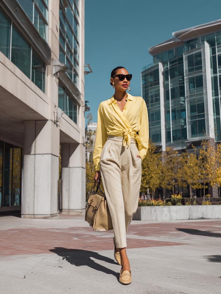 Effortlessly Chic: Yellow Wrap Blouse and Wide-Leg Trousers