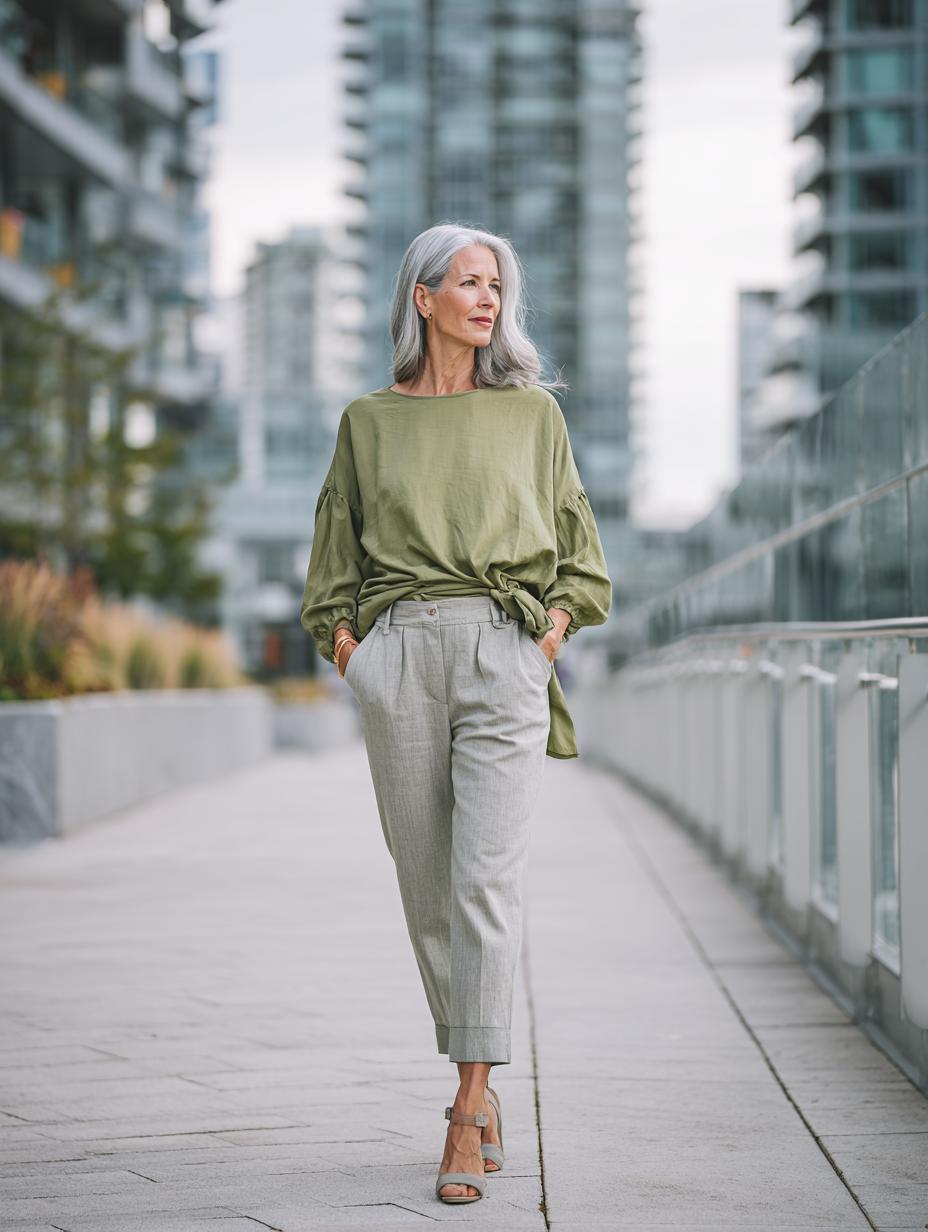 This sophisticated ensemble proves that covering your arms doesn’t mean sacrificing style. The oversized olive green linen blouse features billowy sleeves that gracefully drape while providing full coverage, and the clever front tie detail creates a flattering waistline. Paired with high-waisted wide-leg trousers in a complementary neutral tone, this look strikes the perfect balance between professional polish and relaxed sophistication. The monochromatic earth-tone palette feels fresh and modern, while the flowing silhouettes ensure comfort without looking baggy or frumpy.