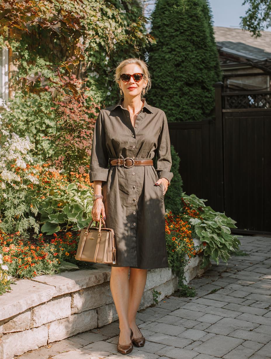 This sophisticated olive green shirt dress proves that covering your arms doesn’t mean sacrificing style. The tailored button-front design features a classic collar and long sleeves that provide elegant coverage while maintaining a polished silhouette. The midi length and cinched waist create a flattering shape that’s perfect for both professional settings and casual outings. Paired with neutral accessories and comfortable flats, this look demonstrates how a well-fitted shirt dress can be both practical and chic for the modern woman over 40.