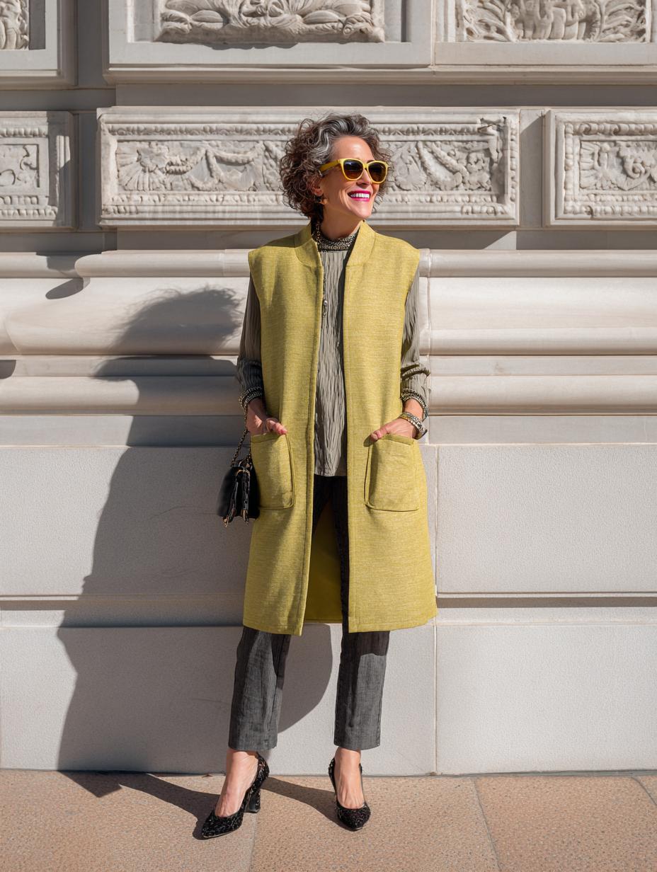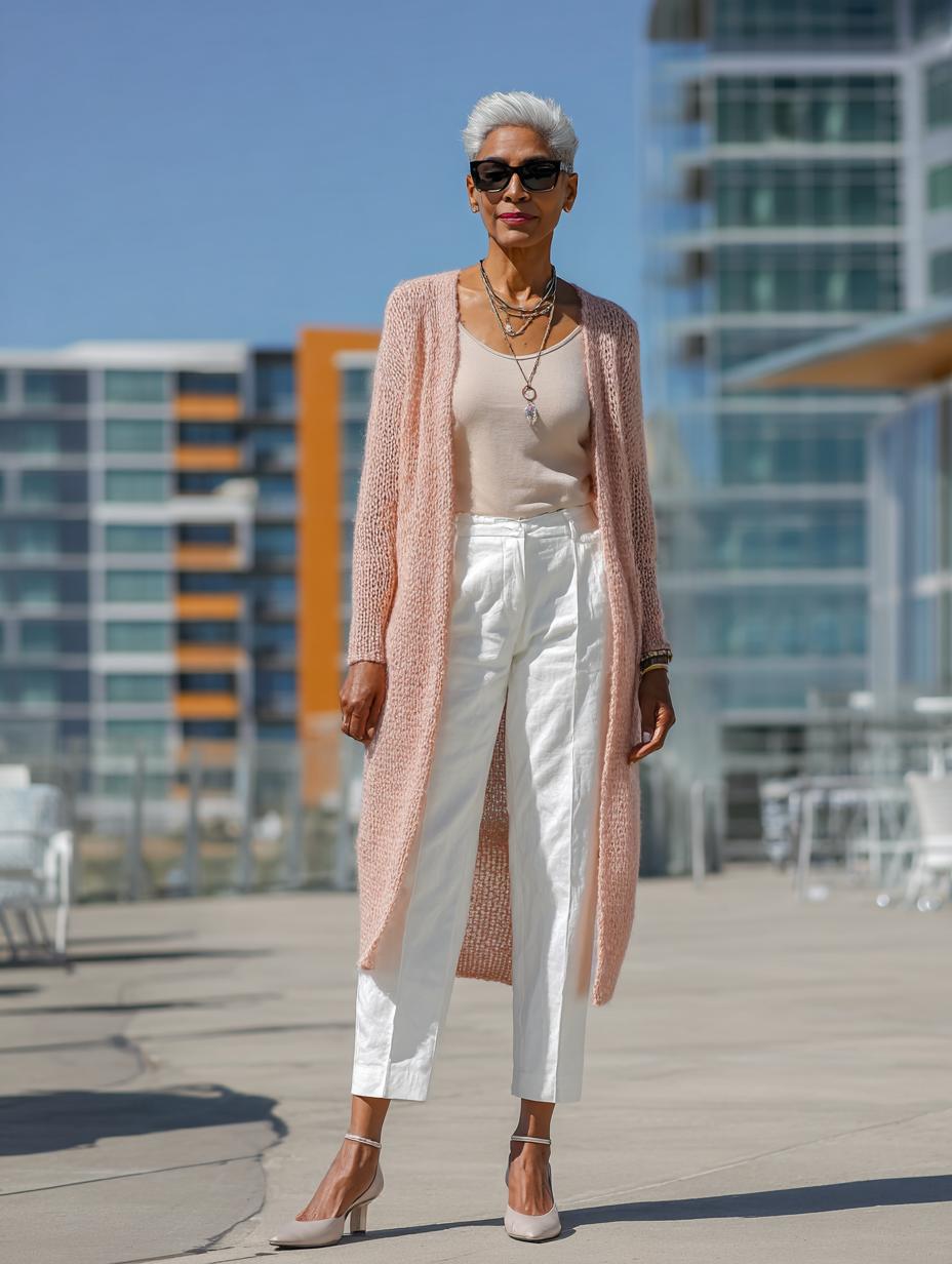 This stunning look proves that covering your arms doesn’t mean sacrificing style. The long, open-front cardigan creates elegant vertical lines while providing comfortable coverage, and the neutral color palette feels fresh and modern. The high-waisted white trousers elongate the legs, while the fitted tank creates a balanced silhouette. This ensemble is perfect for everything from casual coffee dates to business meetings, showing that sophisticated dressing after 40 is all about finding pieces that make you feel confident and comfortable.