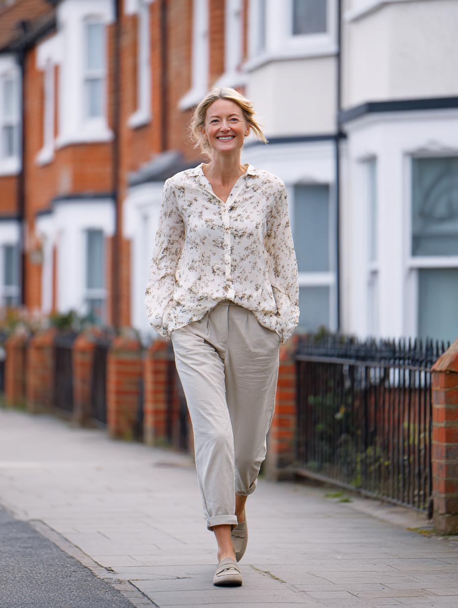 This gorgeous ensemble proves that covering your arms doesn’t mean sacrificing style. The loose-fitting floral blouse with its relaxed silhouette and longer length provides excellent arm coverage while maintaining a feminine, sophisticated look. The key is in the proportions – pairing the flowing top with streamlined neutral trousers creates a balanced silhouette that’s both comfortable and polished. The rolled sleeves add a casual touch while still providing coverage, and the overall neutral color palette keeps the look refined and age-appropriate. This outfit is perfect for everything from casual coffee dates to lunch meetings, proving that modest can absolutely be modern.