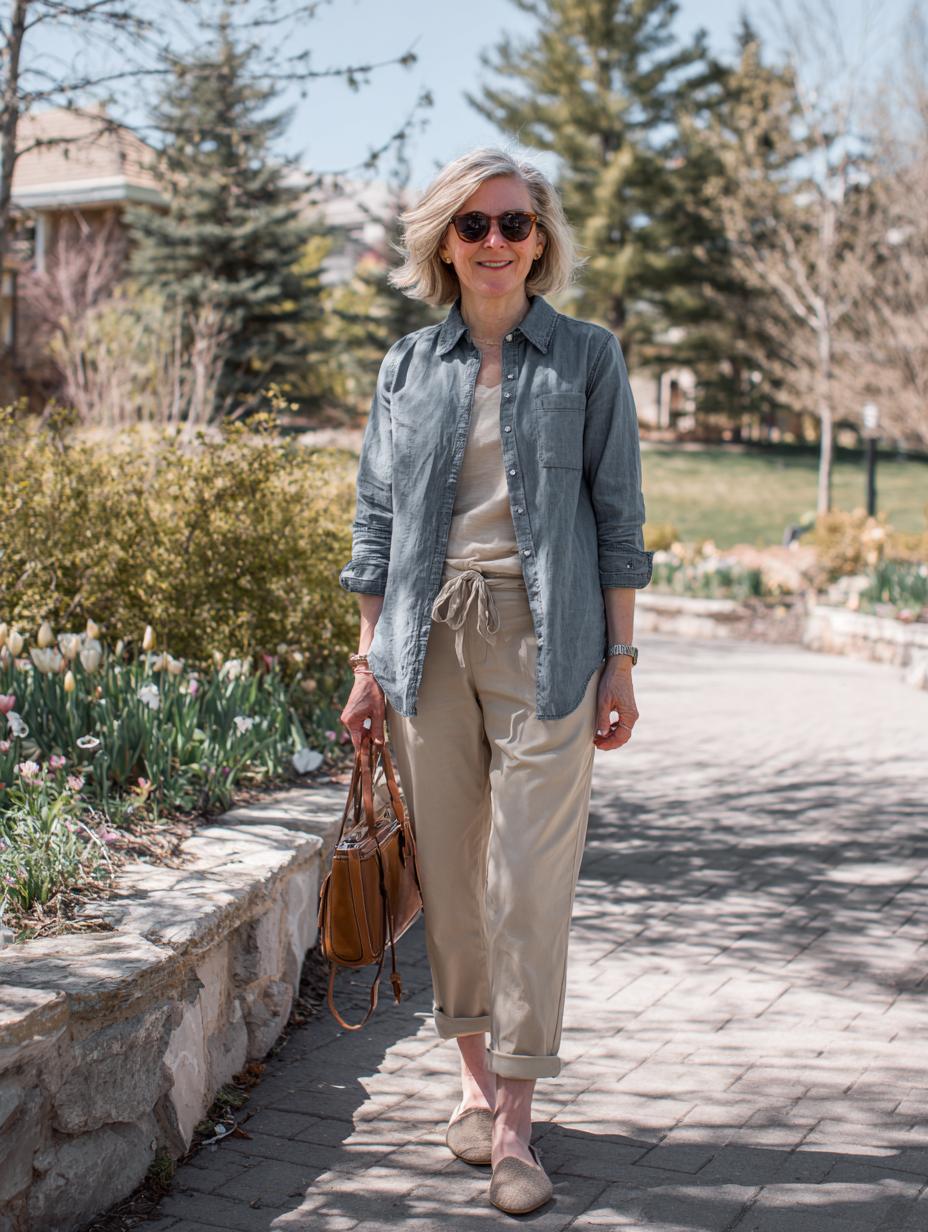 Effortless Spring Layers: Chambray Shirt Over Neutral Separates