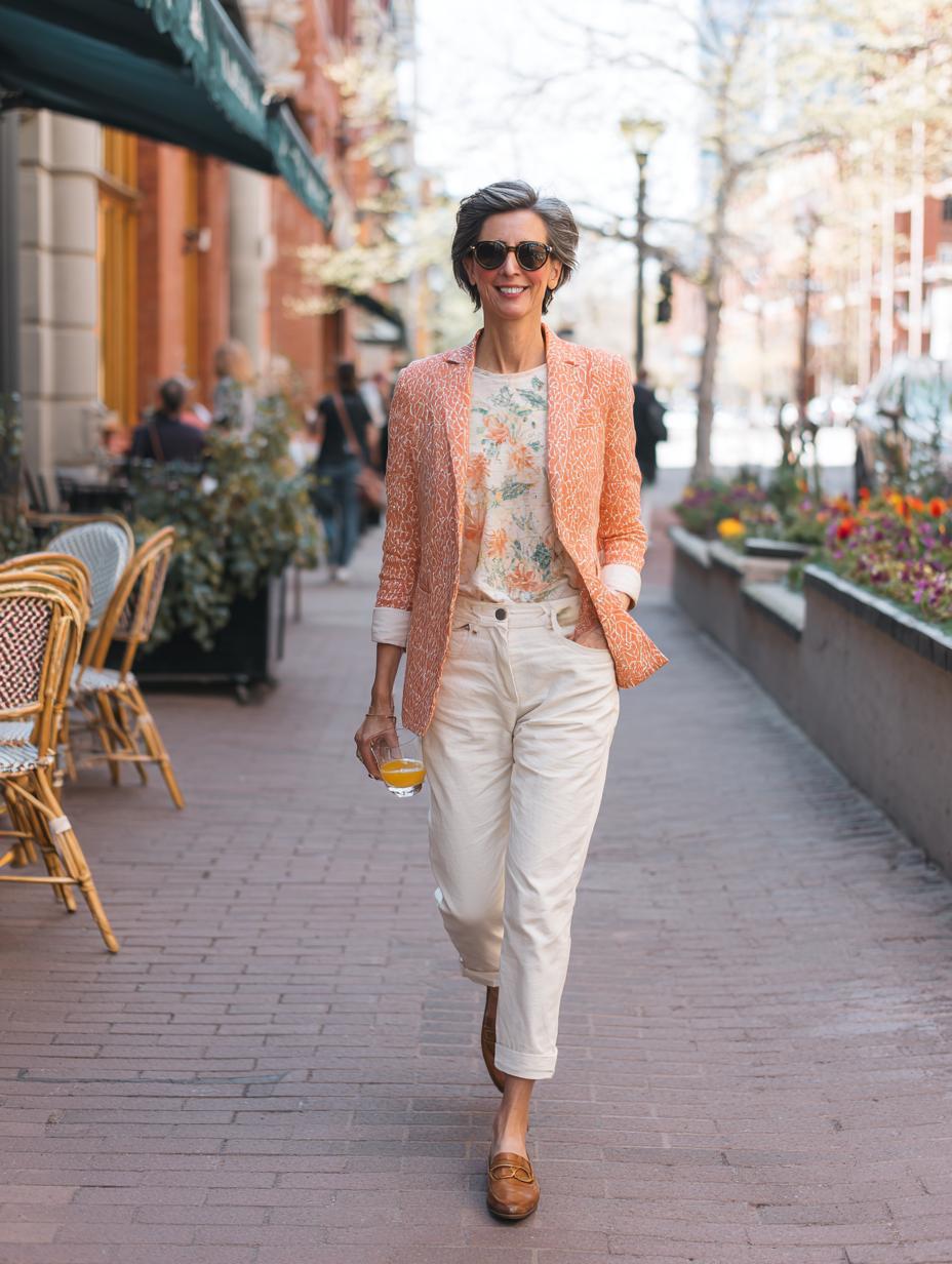 This stunning ensemble proves that arm coverage can be absolutely elegant. The coral textured blazer provides sophisticated coverage while its relaxed fit and rolled sleeves keep the look fresh and modern. Paired with cream wide-leg trousers and a delicate floral top, this outfit strikes the perfect balance between polished and approachable. The neutral color palette with a pop of coral creates a youthful, spring-ready vibe that’s perfect for brunch dates, casual work days, or weekend shopping. The key is choosing pieces with structure that don’t cling, allowing you to feel confident and comfortable while looking effortlessly put-together.