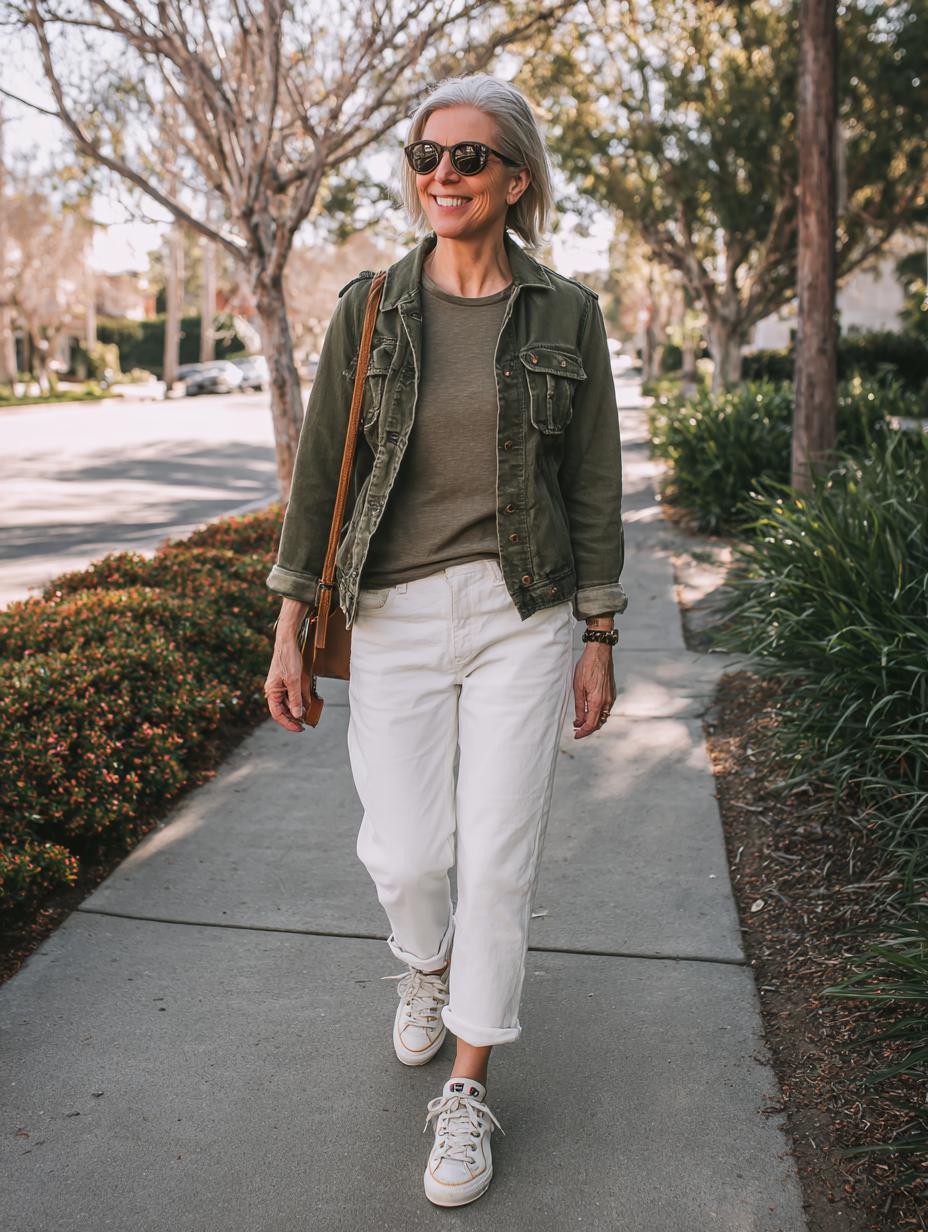 This casual-cool outfit proves that covering your arms doesn’t mean sacrificing style. The olive green denim jacket provides the perfect amount of coverage while maintaining a relaxed, effortless vibe. Layered over a soft sage tee and paired with crisp white boyfriend jeans, this look strikes the ideal balance between comfort and polish. The rolled cuffs and relaxed fit keep everything feeling fresh and modern, while the neutral color palette ensures versatility for any casual outing.