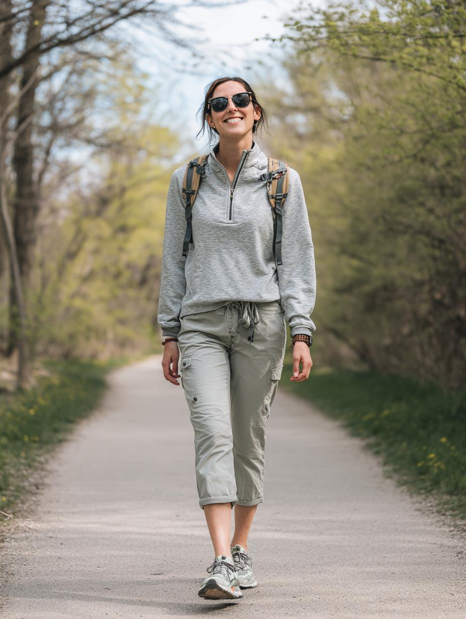 This sporty-casual look proves that covering your arms doesn’t mean sacrificing style or comfort. The relaxed-fit quarter-zip pullover offers excellent arm coverage while maintaining a youthful, active vibe that’s perfect for women over 40. The neutral color palette creates a cohesive, put-together appearance, while the athletic-inspired pieces ensure you look ready for adventure rather than frumpy. This outfit works beautifully for outdoor activities, casual weekends, or running errands while keeping you comfortable and confident.