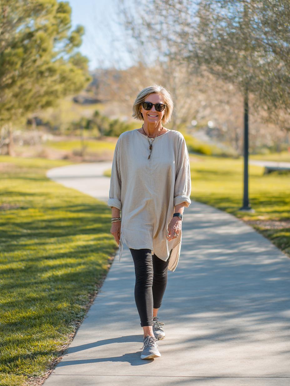 This casual-meets-sophisticated look proves that arm coverage doesn’t mean sacrificing style. The oversized tunic creates a relaxed silhouette that skims the body beautifully, while the three-quarter sleeves provide coverage without bulk. The neutral tone keeps things fresh and modern, while the loose fit allows for comfortable movement. Paired with fitted bottoms, this creates the perfect proportional balance that’s both flattering and age-appropriate. The key is choosing pieces that drape well and investing in quality fabrics that move with you.