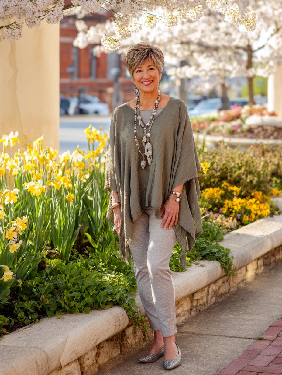 This sophisticated spring look proves that covering your arms doesn’t mean sacrificing style. The flowy olive green poncho creates beautiful draping that skims over the arms while maintaining an elegant silhouette. Paired with fitted gray leggings and finished with layered statement jewelry, this outfit strikes the perfect balance between comfort and polish. The neutral color palette feels fresh and modern, while the relaxed fit keeps you comfortable throughout the day. This is an ideal formula for women over 40 who want to feel confident and chic while maintaining coverage.