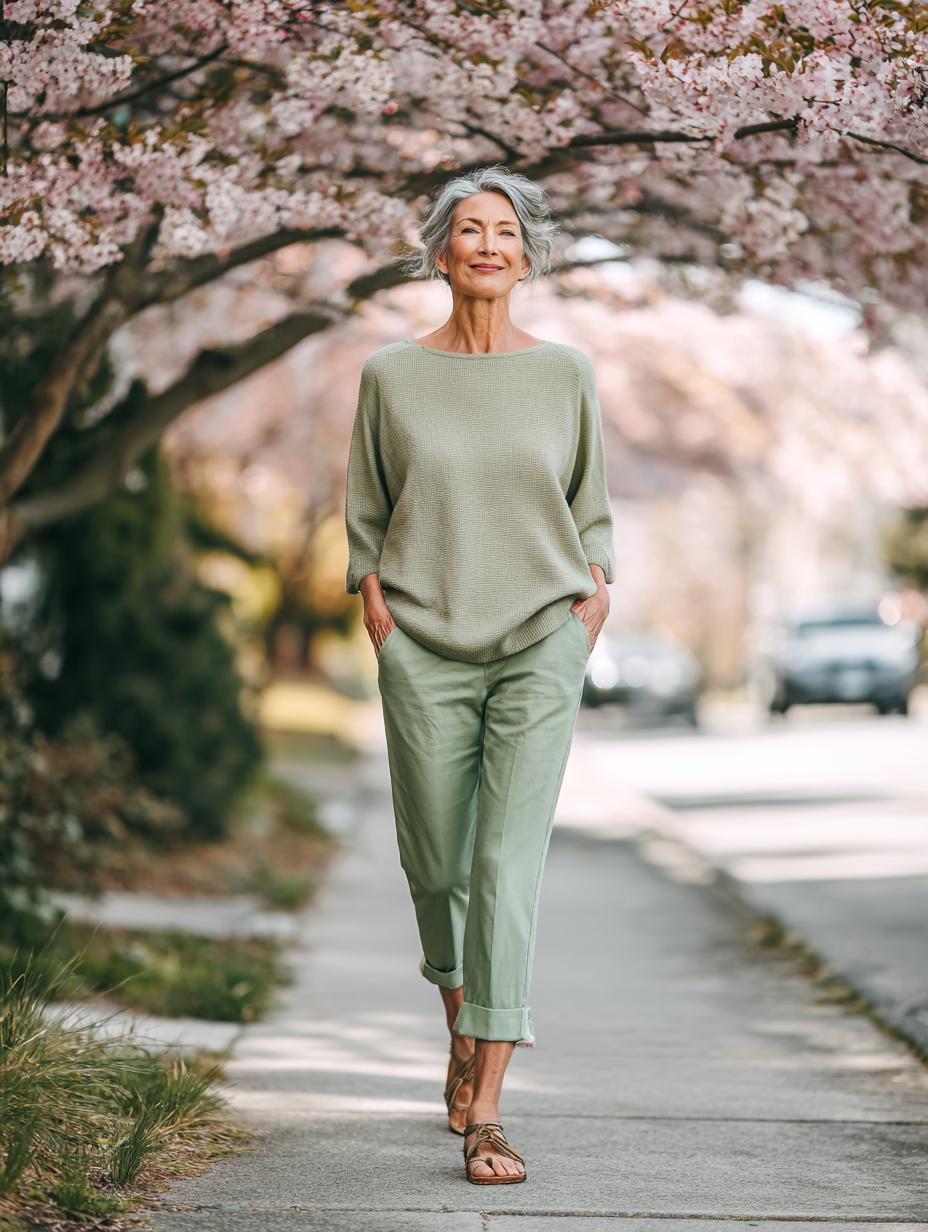 This effortlessly chic ensemble proves that covering your arms doesn’t mean sacrificing style. The sage green knit sweater features a relaxed boat neck and three-quarter sleeves that provide elegant arm coverage while maintaining a modern silhouette. Paired with matching cropped trousers, this monochromatic look creates a streamlined appearance that’s both sophisticated and comfortable. The tonal dressing approach is incredibly flattering and age-appropriate, while the soft sage hue adds a fresh, contemporary touch. This outfit strikes the perfect balance between coverage and style – ideal for everything from casual coffee dates to lunch meetings.