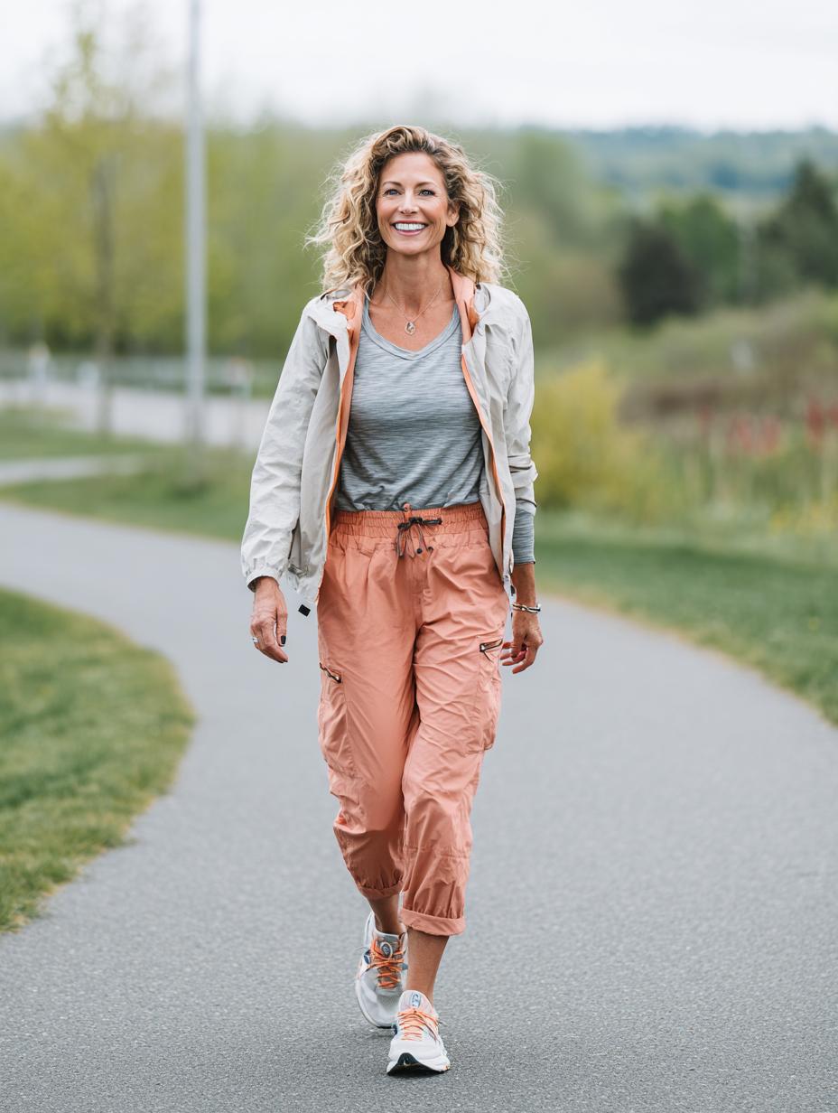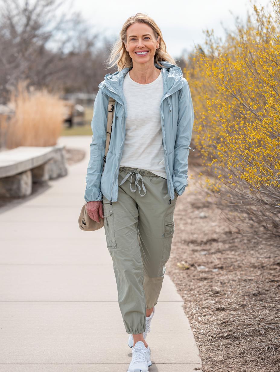 This effortlessly stylish athleisure outfit proves you can stay covered while looking anything but frumpy. The lightweight zip-up jacket provides perfect arm coverage while maintaining a modern, athletic aesthetic. Paired with relaxed cargo-style pants and layered over a simple tank, this look is ideal for casual outings, running errands, or weekend activities. The coordinated color palette creates a pulled-together appearance that’s both comfortable and confident.