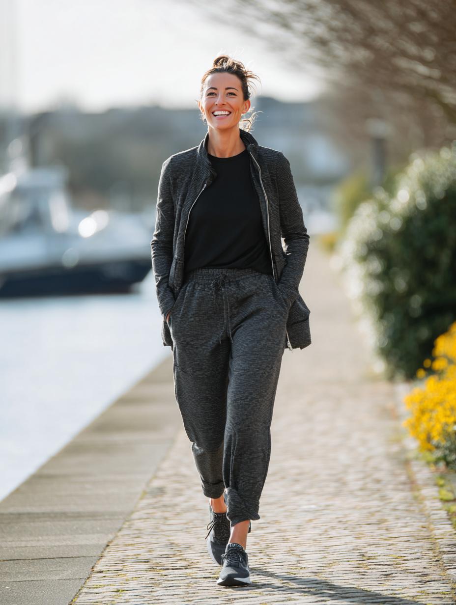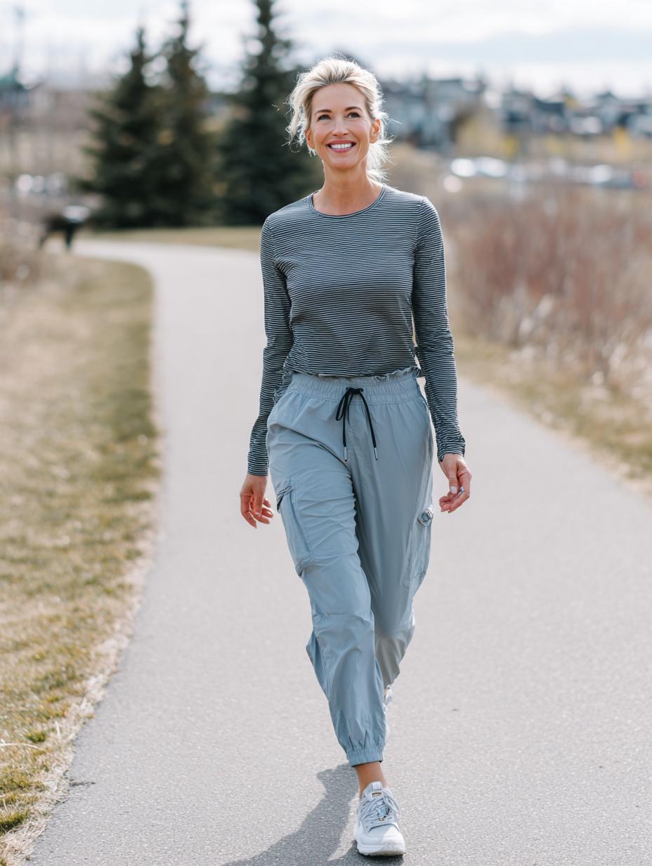 This casual yet polished look proves that comfort and style can go hand in hand for women over 40. The fitted long-sleeve striped top provides full arm coverage while maintaining a flattering silhouette, and when paired with relaxed jogger-style pants, creates an effortlessly chic athleisure outfit. The monochromatic color palette keeps the look sophisticated, while the comfortable fit makes it perfect for weekend errands, casual walks, or low-key social gatherings. This combination strikes the perfect balance between coverage and style without appearing frumpy or oversized.