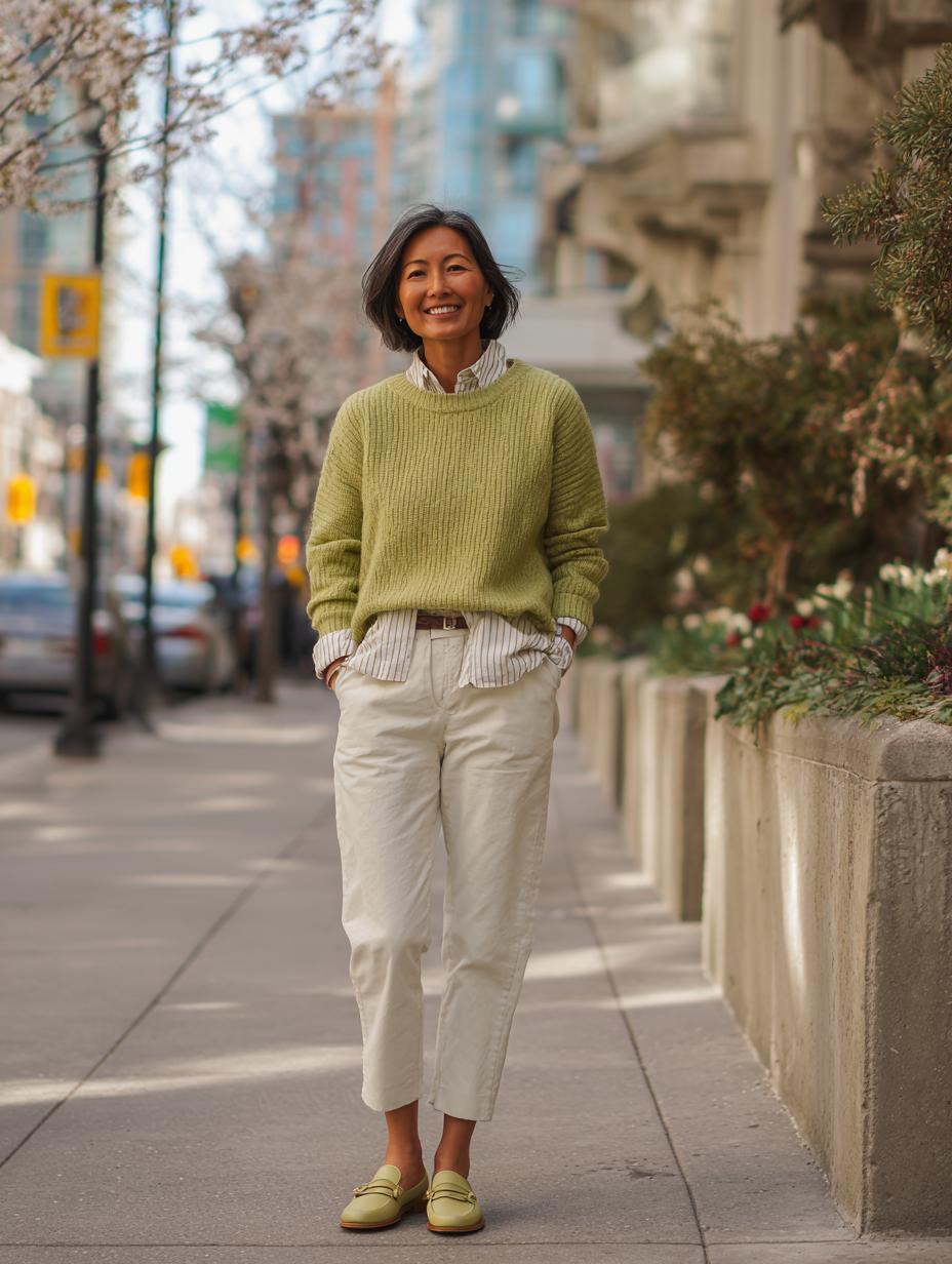 This sophisticated ensemble proves that covering your arms doesn’t mean sacrificing style. The key is in the layering – a cozy sage green sweater worn over a crisp striped shirt creates visual interest while providing comfortable coverage. The relaxed fit of the sweater skims the body beautifully without clinging, while the collar and cuffs of the underneath shirt add a polished touch. Paired with tailored neutral trousers and classic loafers, this look strikes the perfect balance between professional and casual. The monochromatic palette keeps things fresh and modern, while the different textures add depth to the outfit.