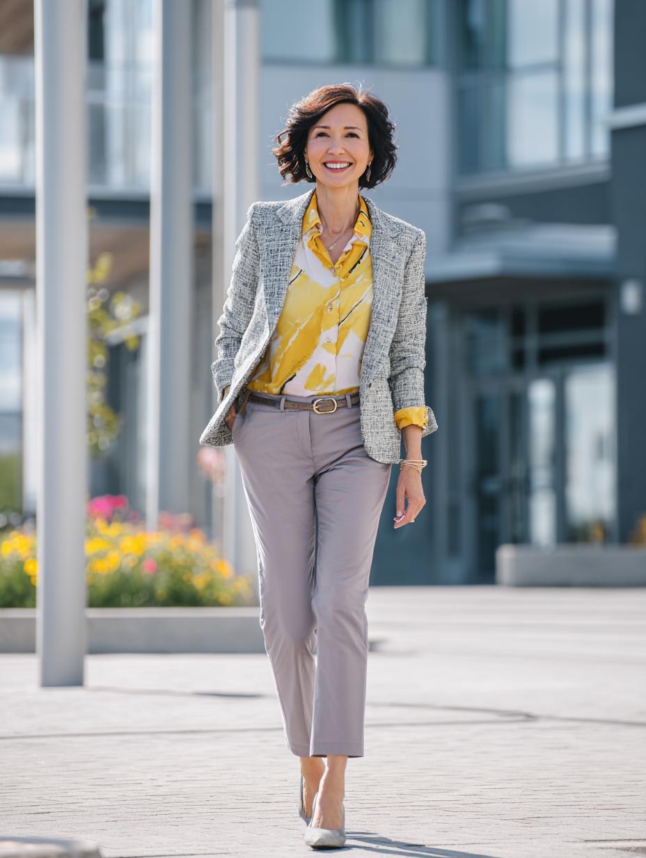 This polished ensemble proves that covering your arms doesn’t mean sacrificing style. The structured grey tweed blazer provides elegant arm coverage while maintaining a tailored silhouette that’s perfect for professional settings. The vibrant yellow printed blouse adds a pop of color and personality, while the neutral trousers create a streamlined look. The key is choosing a blazer with the right fit – structured enough to look intentional, not oversized enough to appear shapeless. This outfit strikes the perfect balance between coverage and confidence.