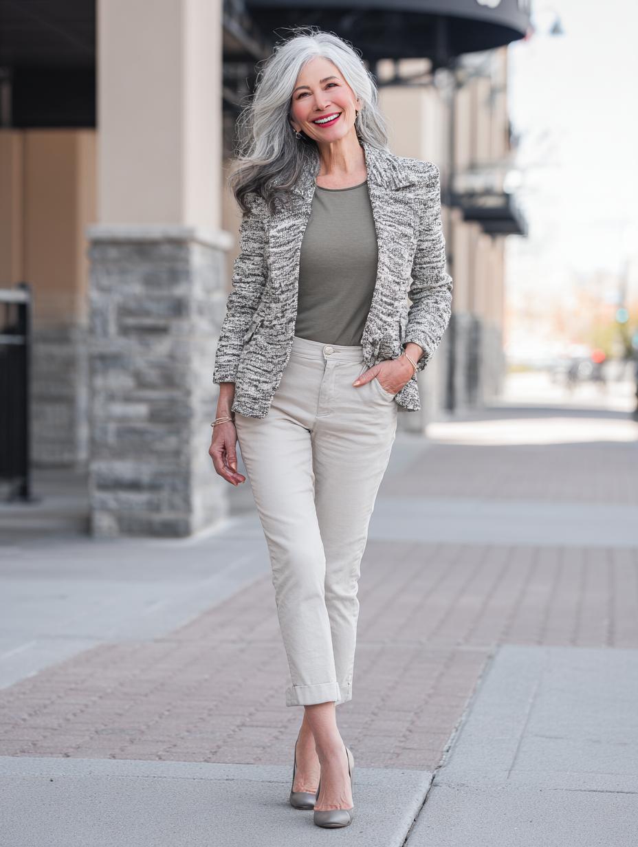 This sophisticated ensemble proves that covering your arms doesn’t mean sacrificing style. The textured tweed blazer in a salt-and-pepper weave provides elegant arm coverage while maintaining a tailored, contemporary silhouette. Paired with neutral cropped trousers and a simple tee, this look strikes the perfect balance between professional and approachable. The monochromatic color palette creates a streamlined appearance that’s both flattering and age-appropriate, while the blazer’s structured shoulders add confidence to your stride.