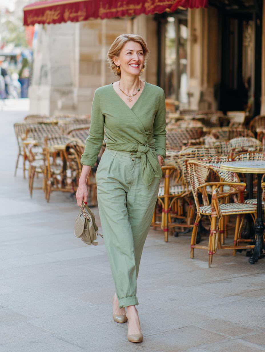 This sophisticated monochromatic sage green ensemble perfectly demonstrates how to achieve elegant arm coverage without sacrificing style. The wrap-style long-sleeve top features a flattering V-neckline and tie waist detail that creates a beautiful silhouette while keeping arms completely covered. Paired with matching wide-leg trousers, this coordinated look is both comfortable and chic. The neutral sage green tone is universally flattering and perfect for transitional seasons. Complete the look with nude block heels and delicate layered jewelry for an effortlessly polished appearance that’s ideal for lunch dates, shopping, or casual business meetings.