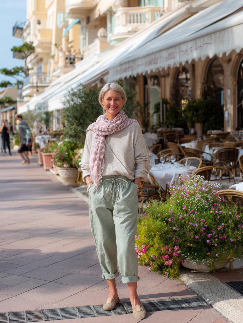 This perfectly balanced casual outfit proves that covering your arms doesn’t mean sacrificing style. The loose-fitting cream sweater provides comfortable coverage while the soft draping creates a flattering silhouette. Paired with relaxed sage green trousers and finished with a delicate striped scarf, this ensemble strikes the ideal balance between comfort and sophistication. The neutral color palette feels fresh and modern, while the relaxed fit of both pieces ensures you look polished without appearing overly covered up. This is the kind of outfit that works beautifully for leisurely strolls, casual lunches, or any occasion where you want to look effortlessly put-together.