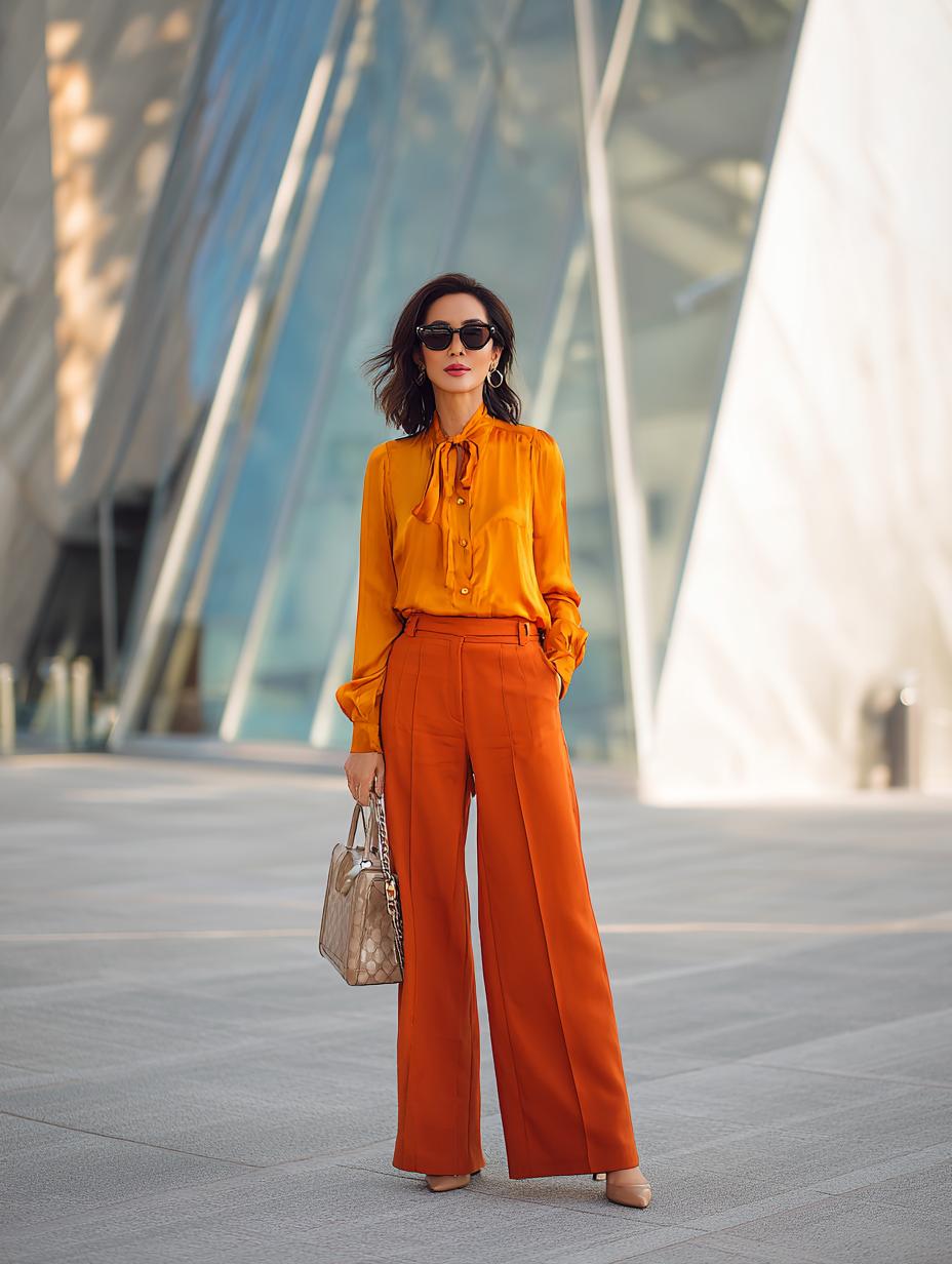 This sophisticated monochromatic orange ensemble proves that arm coverage can be incredibly chic and modern. The flowing long-sleeved blouse with pussy bow detail provides elegant arm coverage while the high-waisted wide-leg trousers create a sleek, elongated silhouette. The tonal orange palette feels fresh and contemporary, while the structured tailoring keeps the look polished rather than frumpy. This outfit works beautifully for business meetings, lunch dates, or any occasion where you want to look put-together while staying comfortably covered.