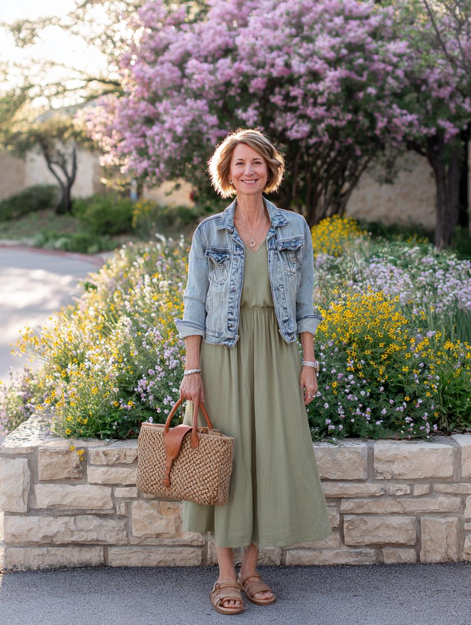 Effortless Spring Elegance: Sage Green Midi Dress with Classic Denim Jacket