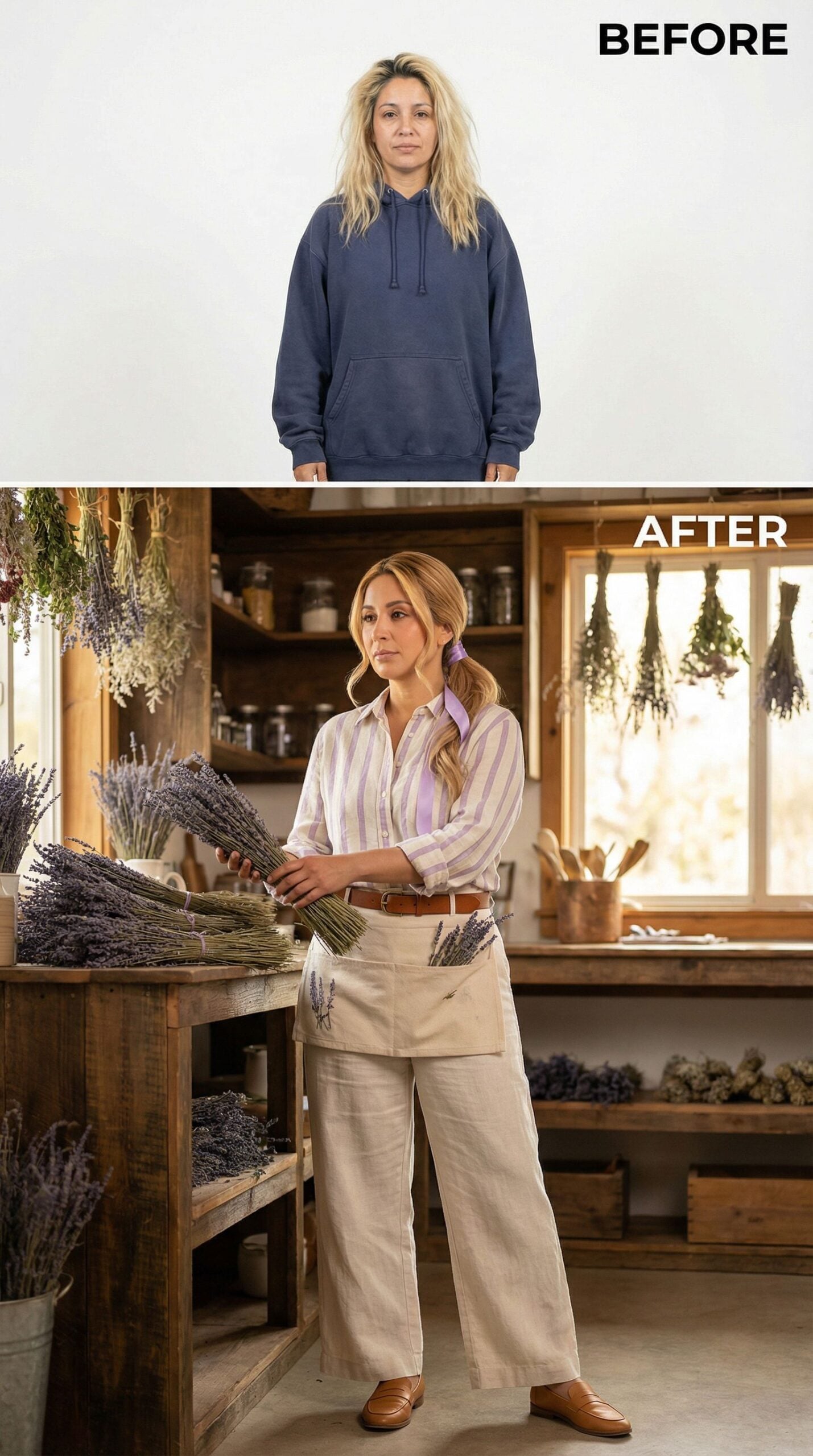Rustic charm meets entrepreneurial spirit as the Provence Lavender Look transforms into a working herb shop aesthetic. Striped linen shirts replace floral midi dresses, while canvas aprons and wide-leg trousers create practical elegance. Honey-blonde waves frame the face as hands work with dried lavender bundles. Stone shelves and hanging herbs complete this artisanal transformation that celebrates both beauty and purpose.