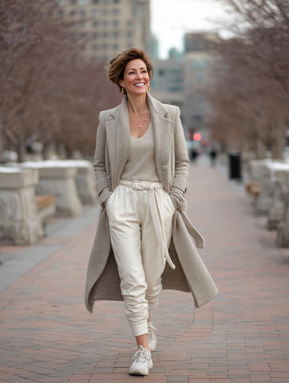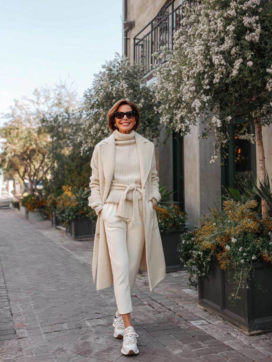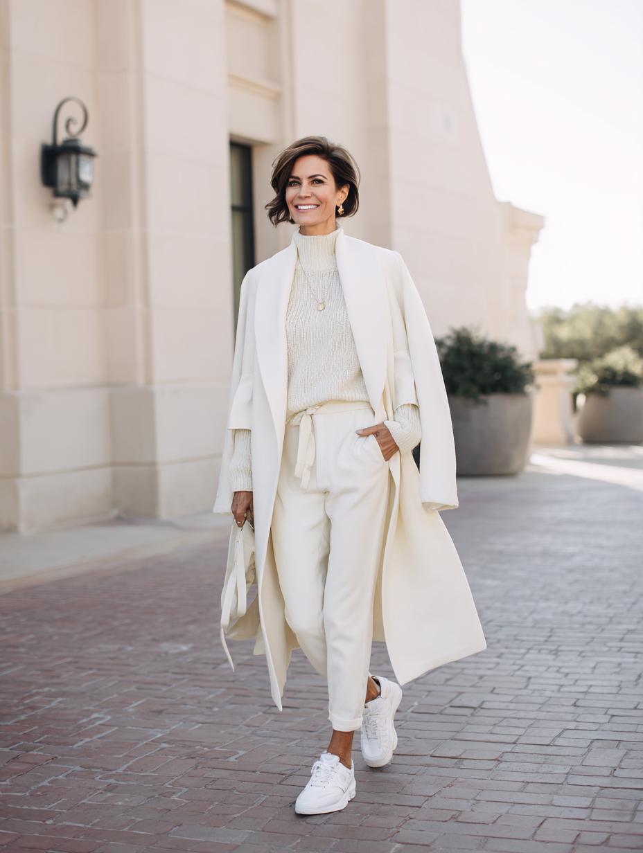 Cream cashmere sweater pairs effortlessly with matching wide-leg trousers, creating an elevated monochromatic foundation. Layer a flowing ivory wool coat for sophisticated warmth that moves beautifully. White leather sneakers ground the luxe fabrics with contemporary edge, while the relaxed silhouette flatters every figure. Perfect for upscale errands, lunch meetings, or weekend gallery visits when comfort meets refinement.