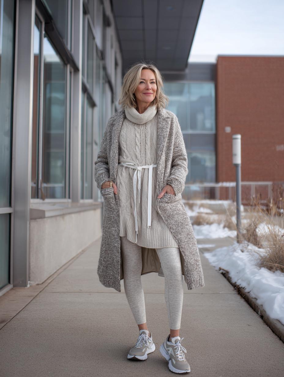 Cable-knit turtleneck dresses create effortless elegance when paired with coordinating leggings and oversized cardigans. Layer neutral tones strategically to build depth while maintaining sophistication. White sneakers ground the monochromatic palette with athletic functionality. Drawstring waists add feminine definition to relaxed silhouettes, proving comfort never compromises style when executed thoughtfully.