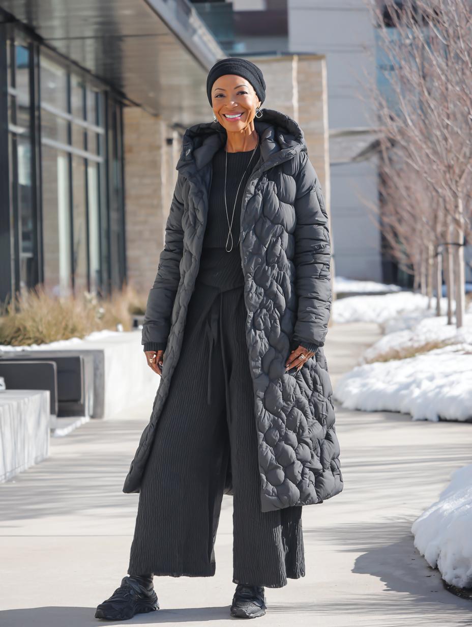 Long charcoal quilted puffers transform basic athleisure into sophisticated winter wear. Pair your floor-length down coat with ribbed knit separates in matching dark tones for seamless color coordination. Add gold jewelry accents and a sleek headwrap to elevate the sporty foundation. Black athletic sneakers ground the look while maintaining comfort for urban adventures.