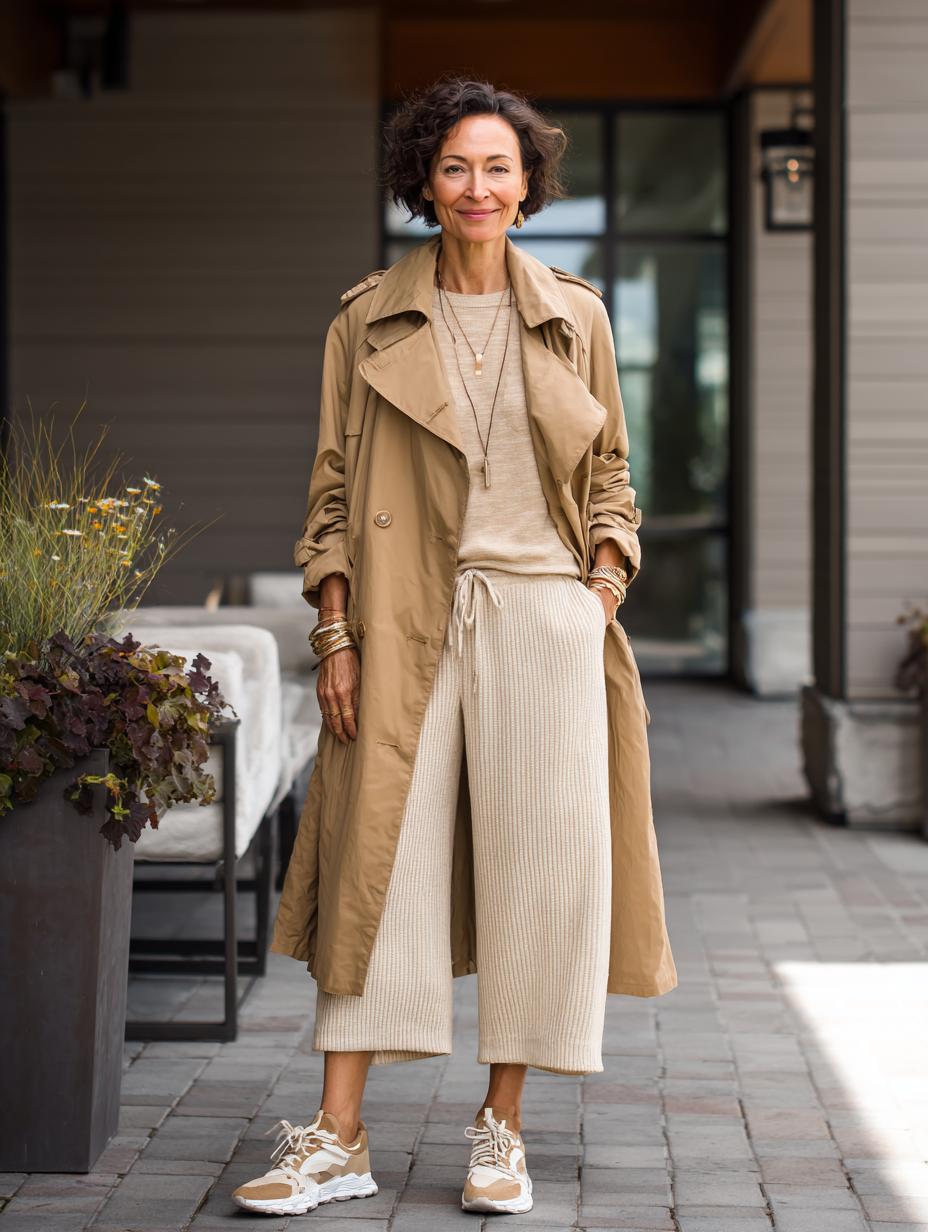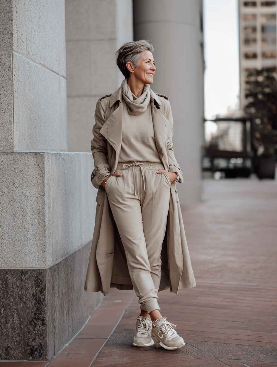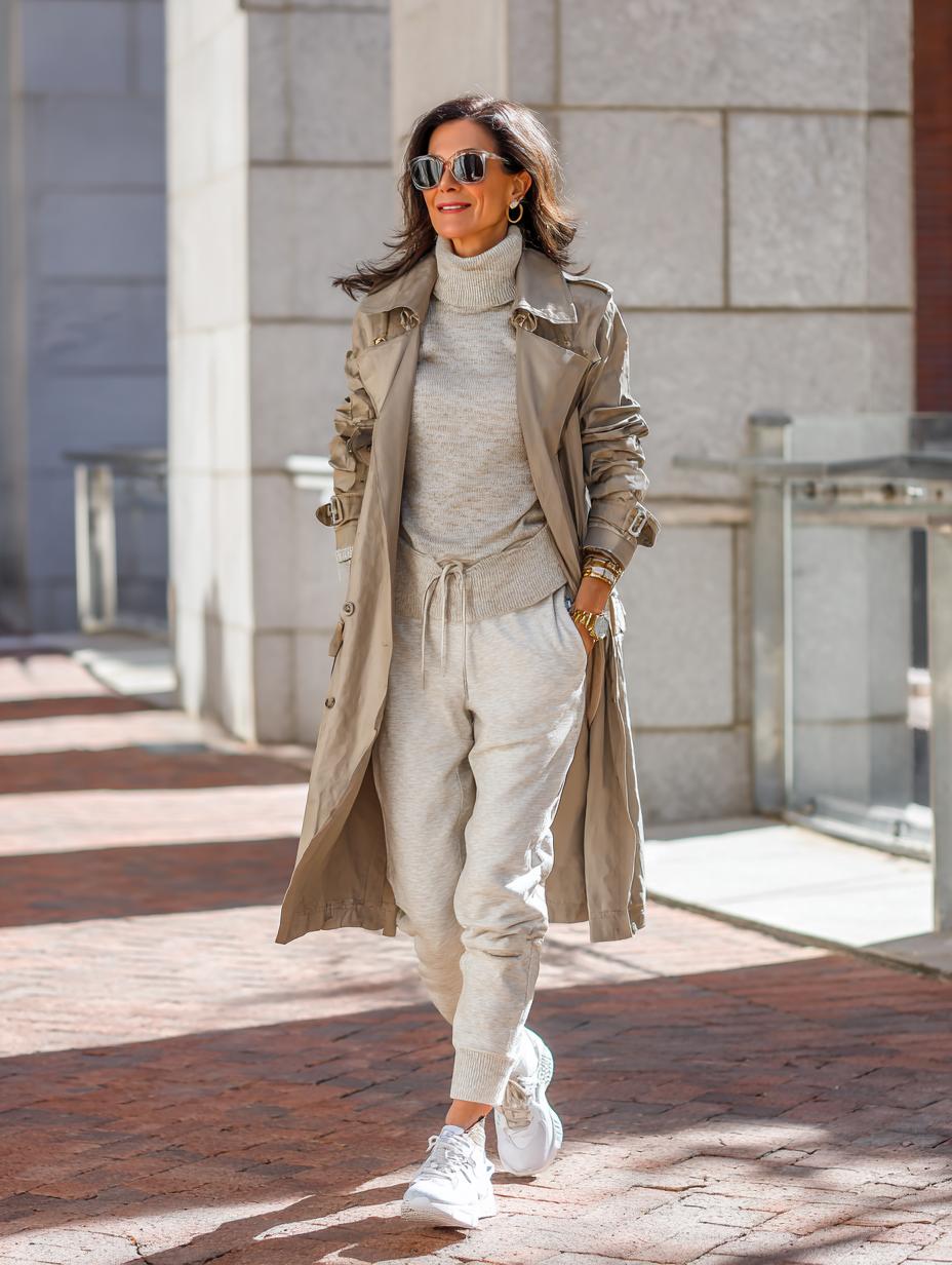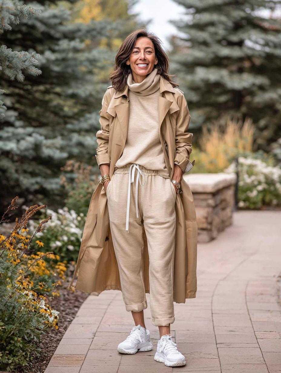 Beige becomes brilliant when layered with intention and finished with premium athletic footwear. The flowing trench coat creates elegant movement while drawstring joggers offer comfortable sophistication. Neutral sneakers ground the monochromatic palette, proving that luxury athleisure thrives in the details. This refined approach to casual dressing elevates everyday errands into stylish statements without sacrificing comfort or versatility.