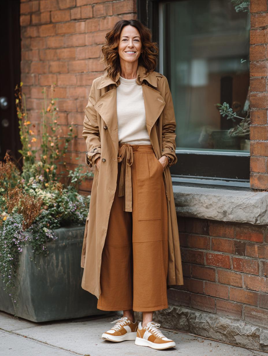 Camel and cognac hues create a masterclass in understated elegance for the modern woman. Wide-leg trousers paired with neutral knitwear establish the foundation, while a classic trench coat adds instant polish. Canvas sneakers ground the look with athletic comfort, proving luxury doesn’t require sky-high heels. This monochromatic approach demonstrates how investing in quality basics pays dividends for effortless daily dressing.