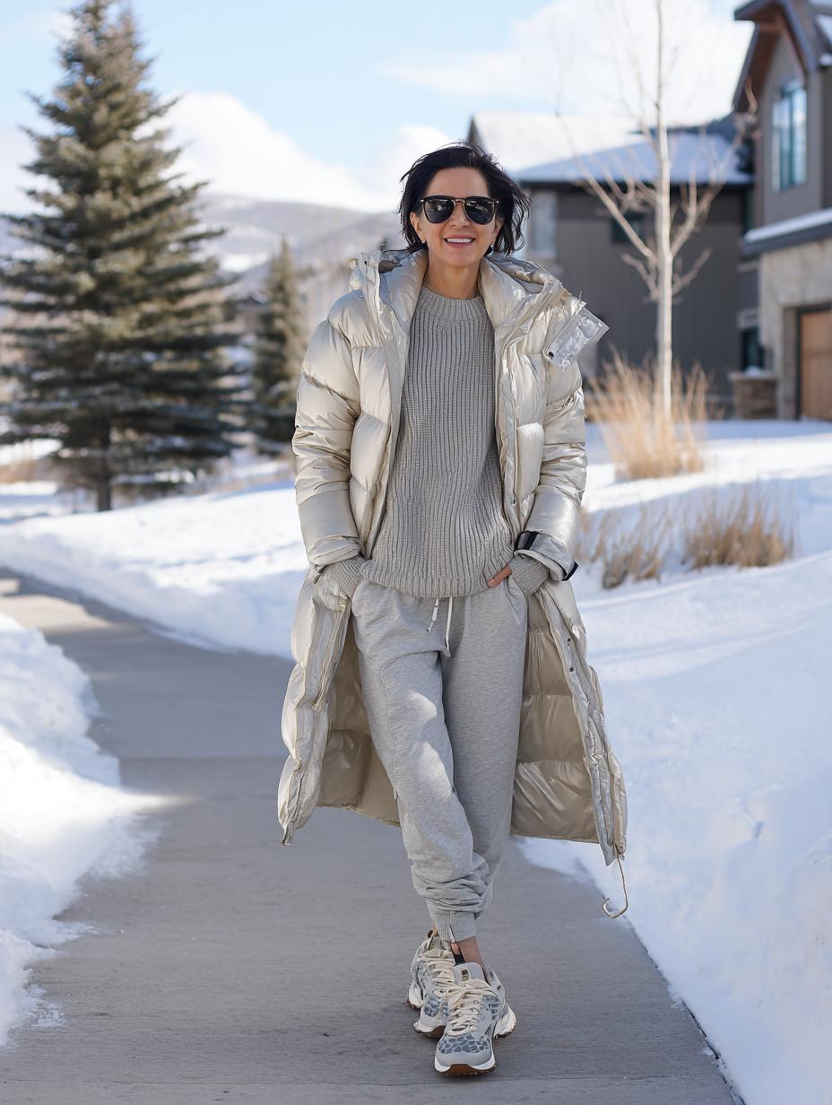 Champagne metallic puffer coat creates striking contrast against coordinated grey knit sweater and matching joggers. Neutral sneakers ground the monochromatic palette while aviator sunglasses add polished finishing touches. Snow-covered sidewalks become your runway when you master this effortlessly refined athleisure combination that prioritizes both warmth and style.