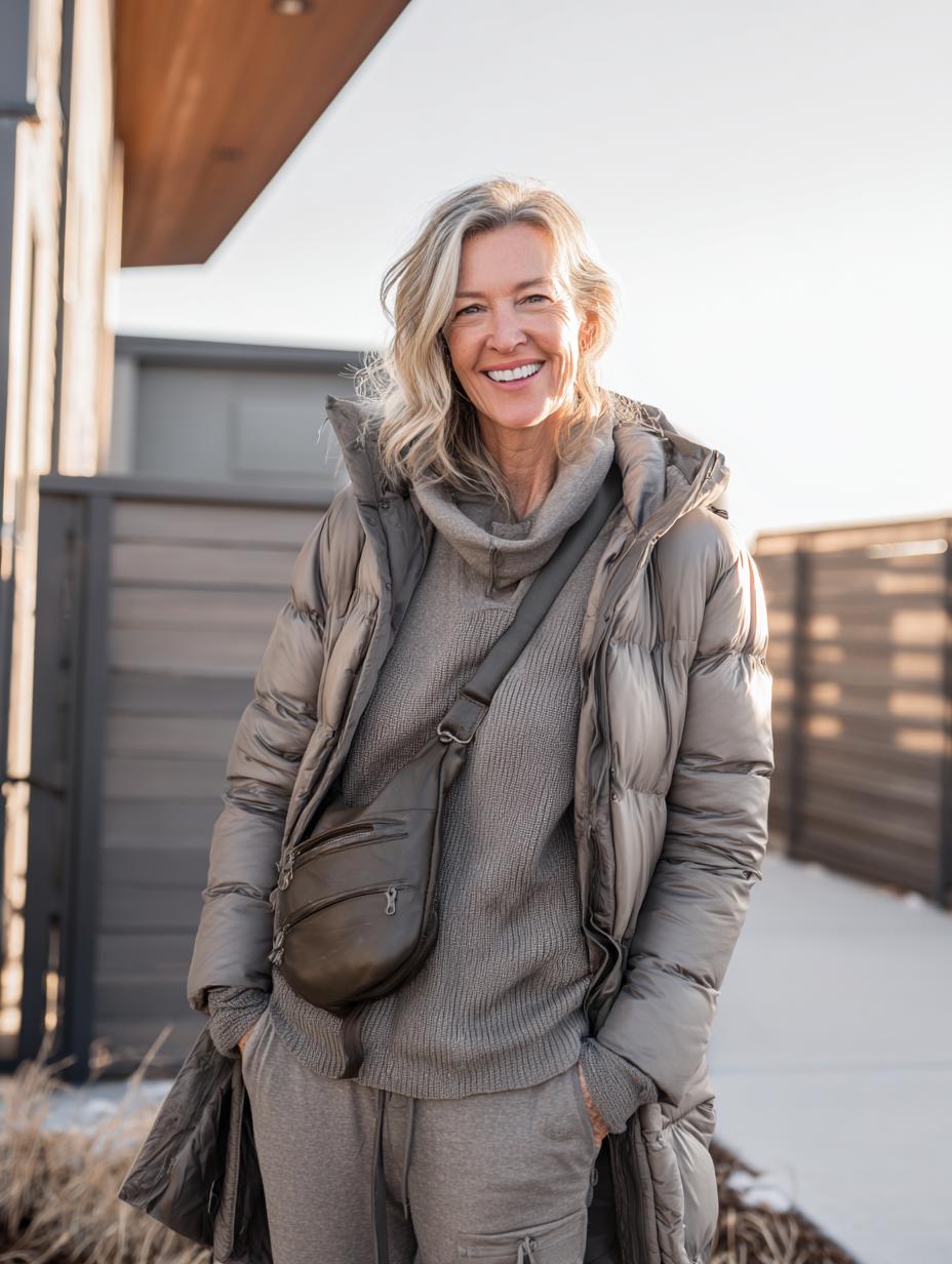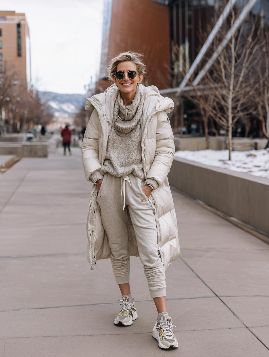 Taupe and grey create sophisticated winter warmth without sacrificing comfort. Layer a chunky knit turtleneck under an oversized puffer coat for effortless elegance. Matching joggers maintain the tonal palette while a structured crossbody bag adds polished functionality. This monochromatic approach elevates casual pieces into quiet luxury territory, proving athleisure can feel refined and intentional for everyday wear.