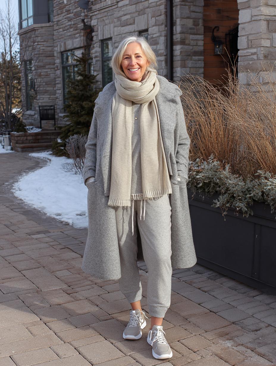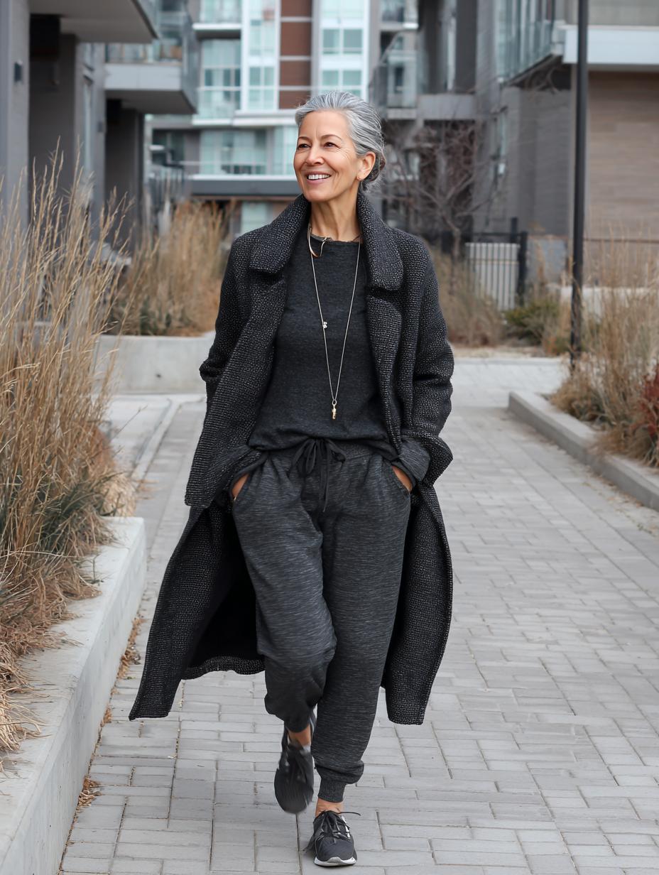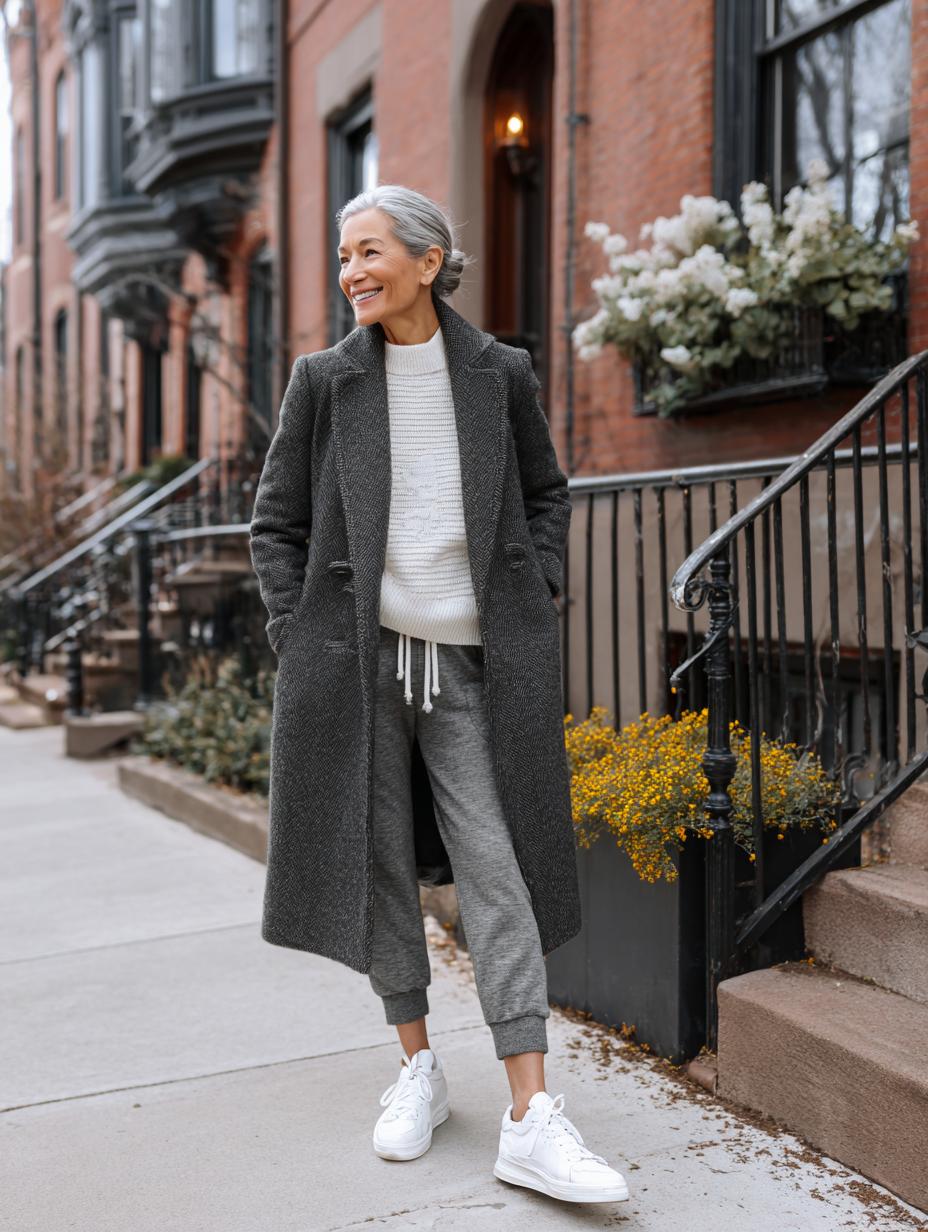 Gray jogger pants paired with a crisp white turtleneck create the foundation for effortless luxury. Layer on a structured charcoal wool coat that hits mid-calf for instant polish. Clean white sneakers ground the look while maintaining comfort for daily errands. Silver hair swept into a low bun adds sophisticated finishing touches to this perfect blend of comfort and refinement.
