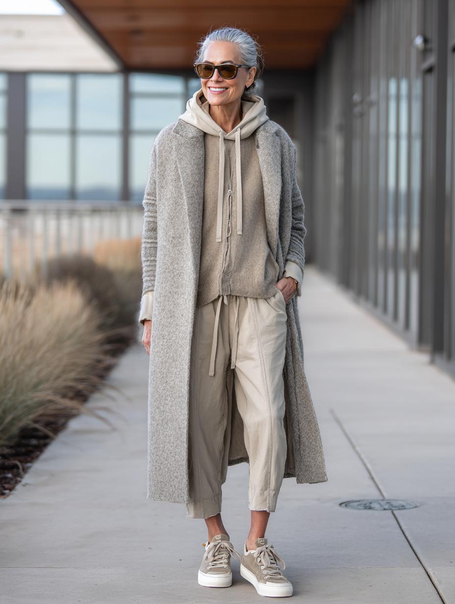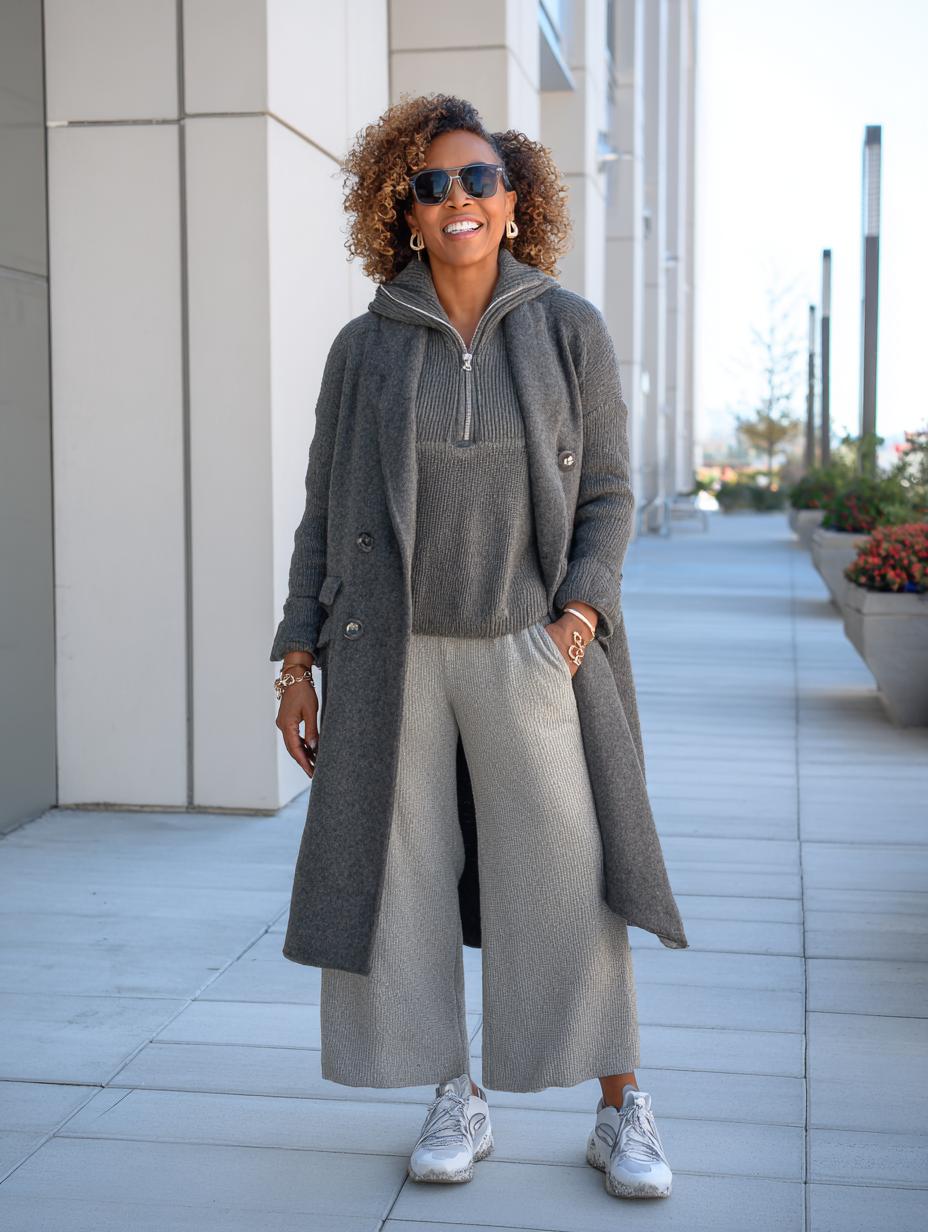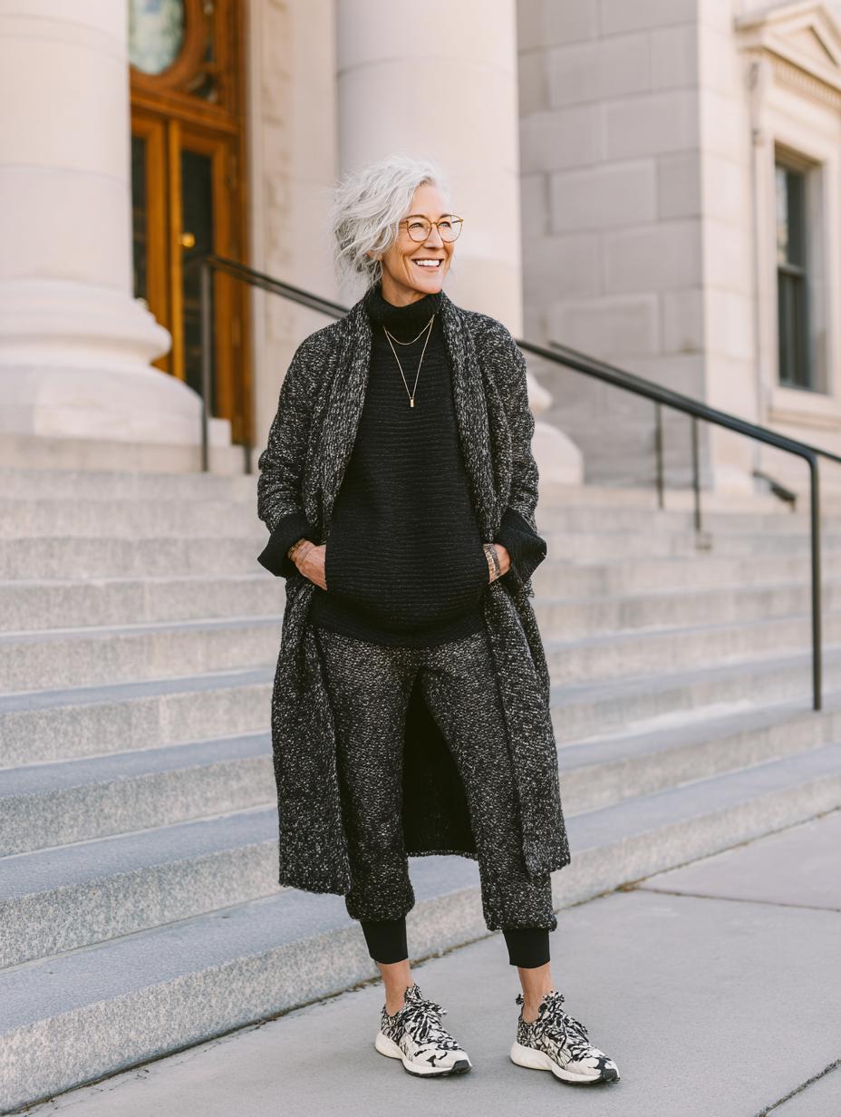 Gray hair radiates confidence while this monochromatic ensemble proves athleisure can feel luxurious. Layered textures create visual interest without sacrificing comfort, from the ribbed turtleneck base to the oversized knit coat that drapes beautifully. Matching wide-leg trousers maintain the streamlined silhouette, while patterned sneakers add unexpected personality. Delicate gold necklaces provide subtle refinement, proving that quiet luxury thrives in the details and thoughtful proportioning.