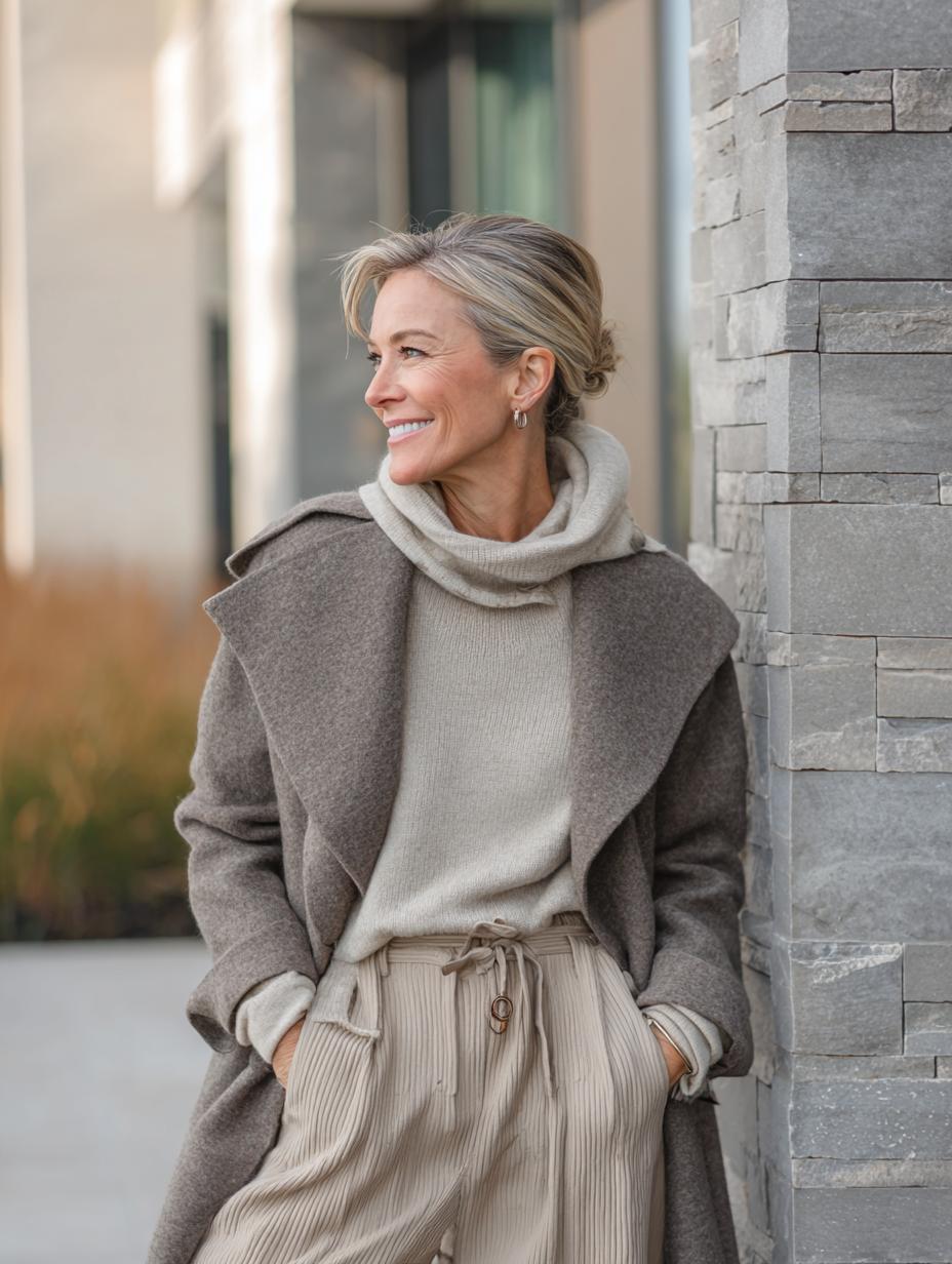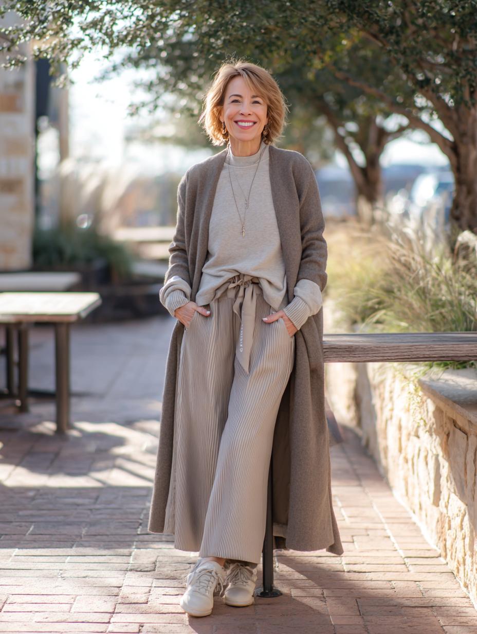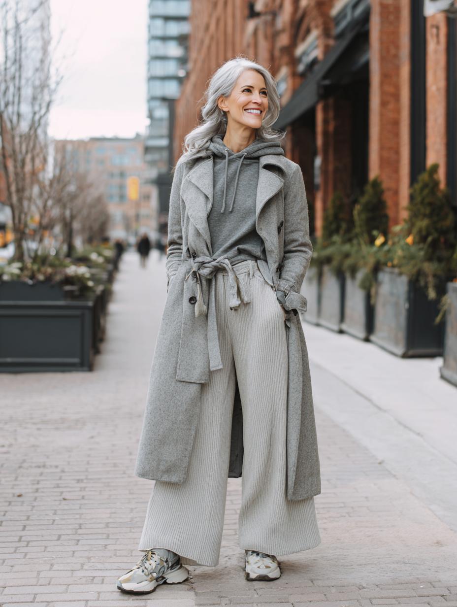 Gray hair radiates confidence while this monochromatic ensemble proves athleisure can feel luxurious. Layered textures create visual interest without sacrificing comfort, from the ribbed turtleneck base to the oversized knit coat that drapes beautifully. Matching wide-leg trousers maintain the streamlined silhouette, while patterned sneakers add unexpected personality. Delicate gold necklaces provide subtle refinement, proving that quiet luxury thrives in the details and thoughtful proportioning.