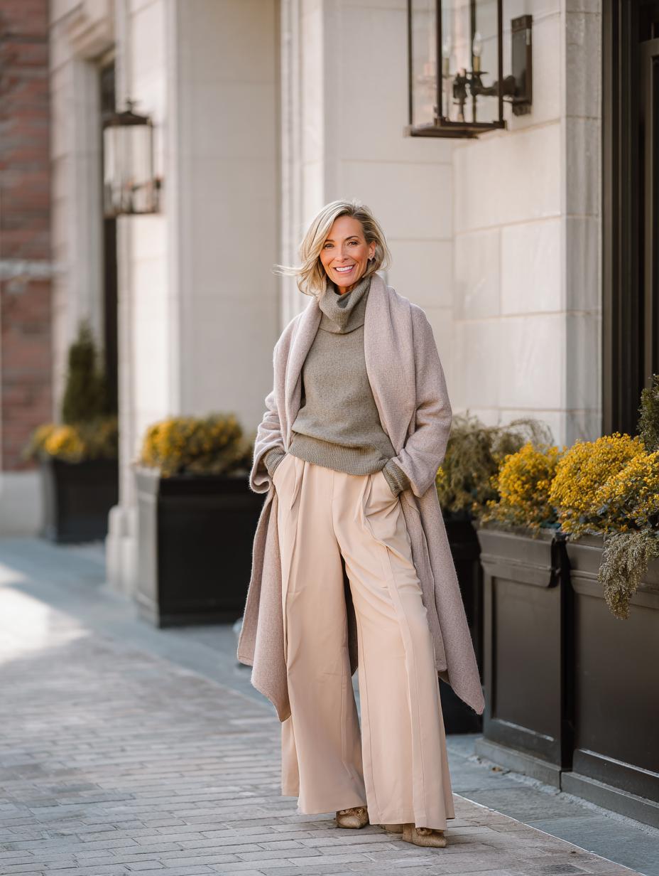 Wide-leg blush trousers paired with a sage turtleneck create an effortlessly sophisticated foundation. Layer a long taupe wool coat over this tonal combination for instant polish. The flowing silhouette flatters every figure while maintaining comfort for busy days. Neutral suede boots ground the look with understated luxury that transitions seamlessly from errands to lunch dates.