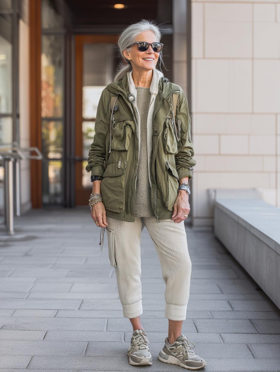 Silver-haired confidence shines in this perfectly balanced athleisure ensemble that proves comfort never sacrifices style. An olive utility jacket with multiple pockets anchors the look over a textured beige sweater, while coordinating ribbed joggers create seamless tonal harmony. Neutral sneakers and layered metallic jewelry add sophisticated finishing touches that elevate casual comfort into quiet luxury territory.