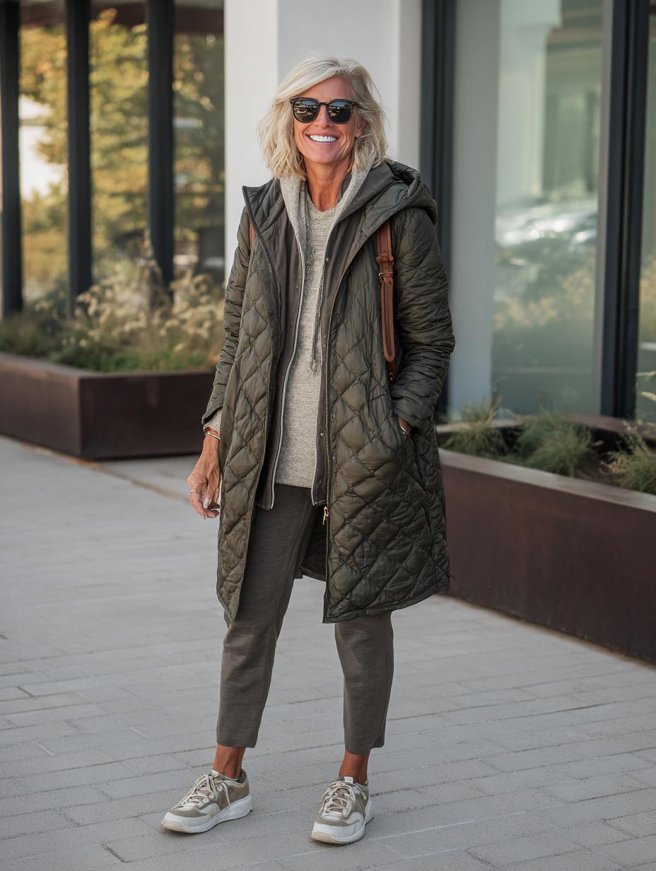 Olive green creates a sophisticated monochromatic moment when layered thoughtfully from head to toe. The quilted longline coat adds luxurious texture while maintaining practicality, paired seamlessly with a cozy knit hoodie underneath. Matching joggers and canvas sneakers complete this refined athletic look that transitions effortlessly from coffee runs to casual meetings with understated elegance.