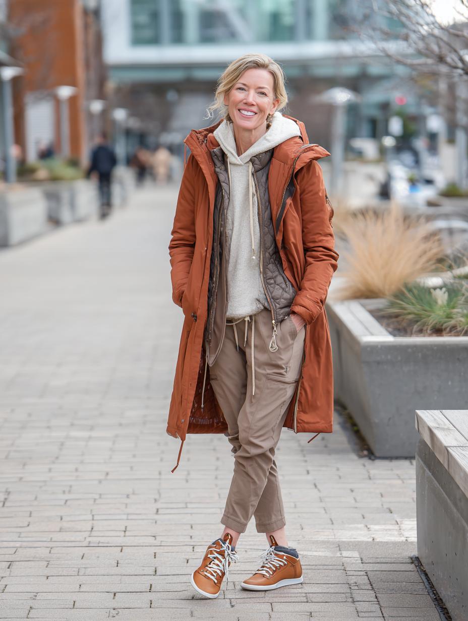 Burnt orange technical parka anchors this sophisticated athletic-inspired look with its sleek silhouette and premium finish. Layered beneath, a cream hoodie pairs seamlessly with taupe joggers, creating effortless coordination. Orange leather sneakers echo the outerwear while maintaining the understated luxury aesthetic. This ensemble proves athleisure can be refined and age-appropriate without sacrificing comfort or style.