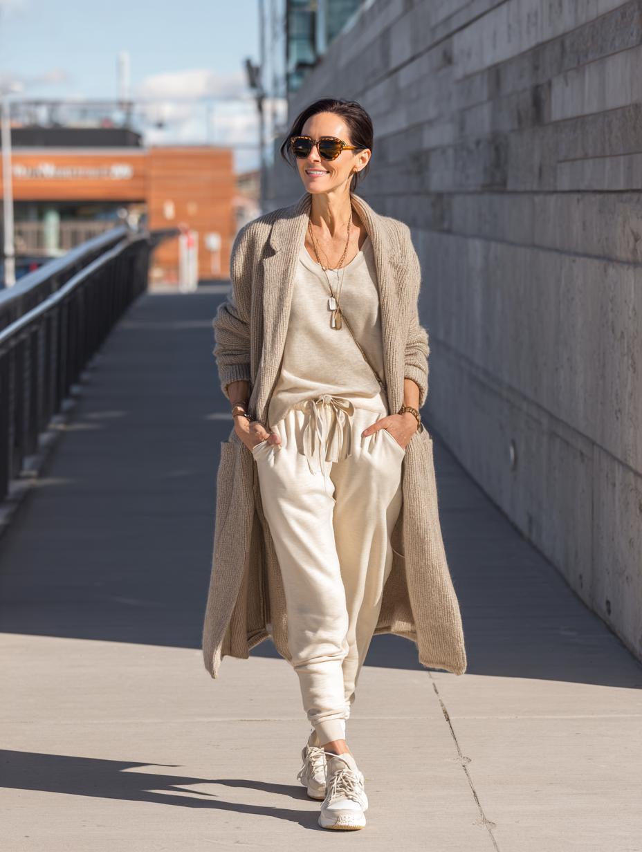 Neutral tones create the foundation for this effortlessly chic look that transitions seamlessly from errands to coffee dates. The matching knit set provides comfort without sacrificing style, while the long cardigan adds sophisticated layering. Neutral sneakers ground the ensemble, proving that athleisure can be both refined and practical for busy women who refuse to compromise on style.