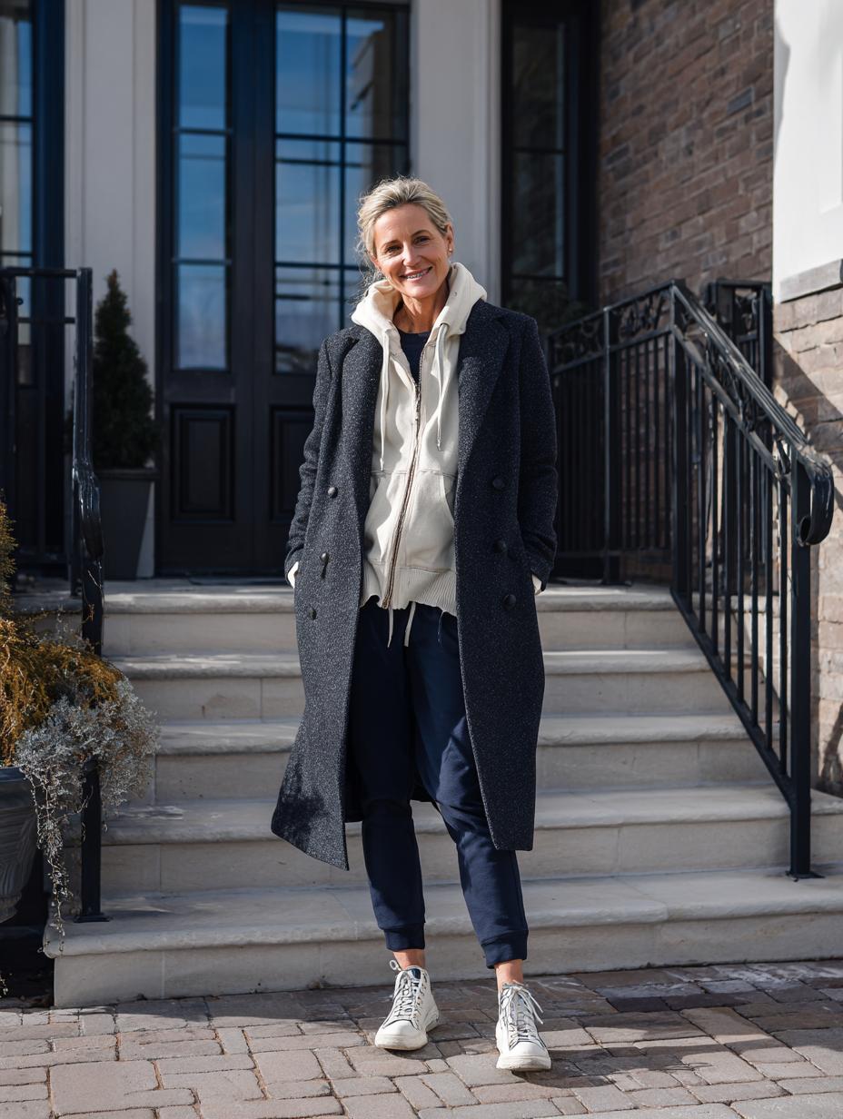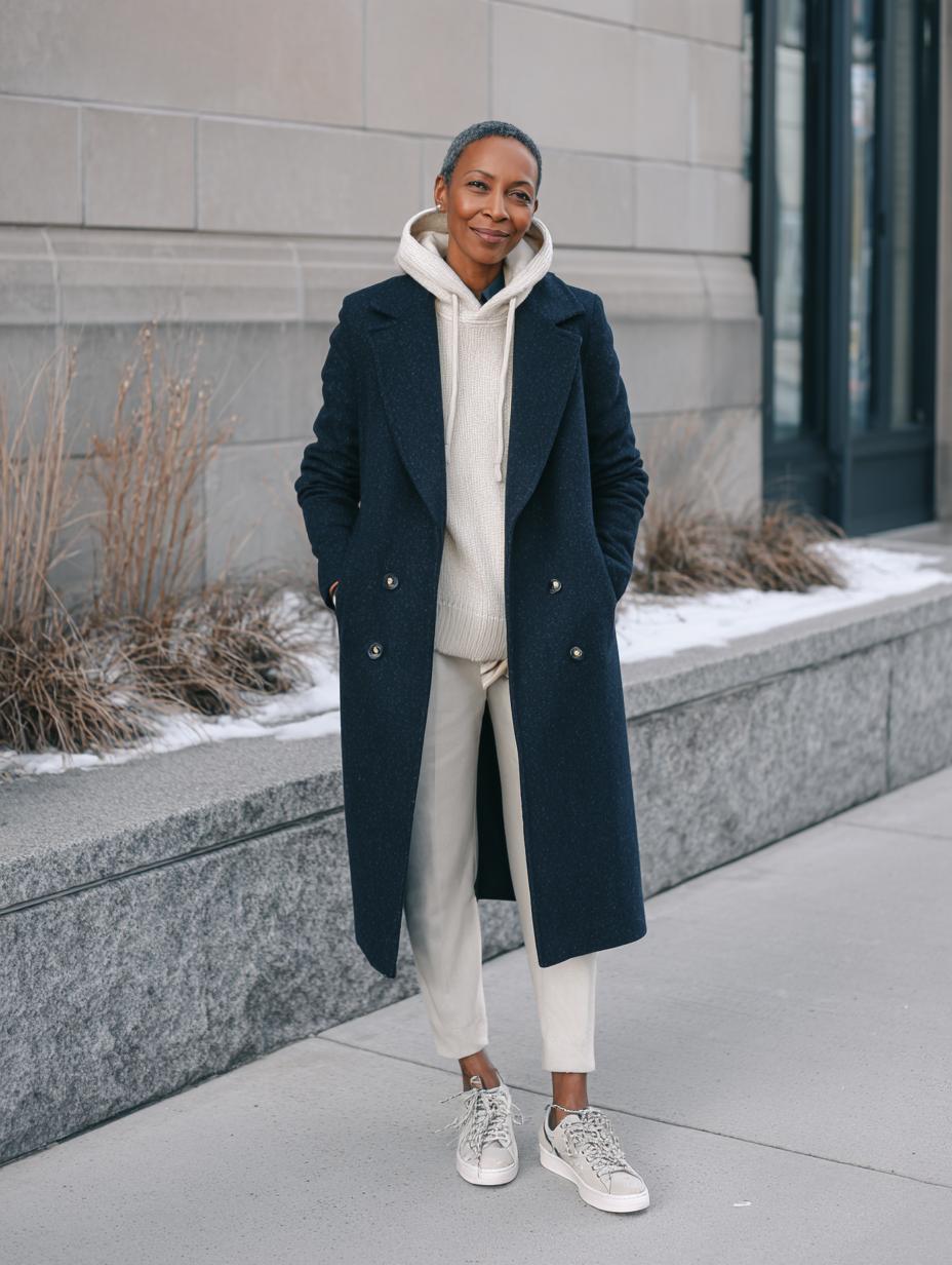 Navy wool double-breasted coat transforms a simple cream hoodie into refined winter elegance. Neutral wide-leg trousers create clean lines while maintaining comfort, perfectly balancing athletic ease with luxury aesthetics. White leather sneakers ground the look with contemporary sophistication, proving athleisure can seamlessly transition from gym sessions to upscale brunches without sacrificing style or comfort.