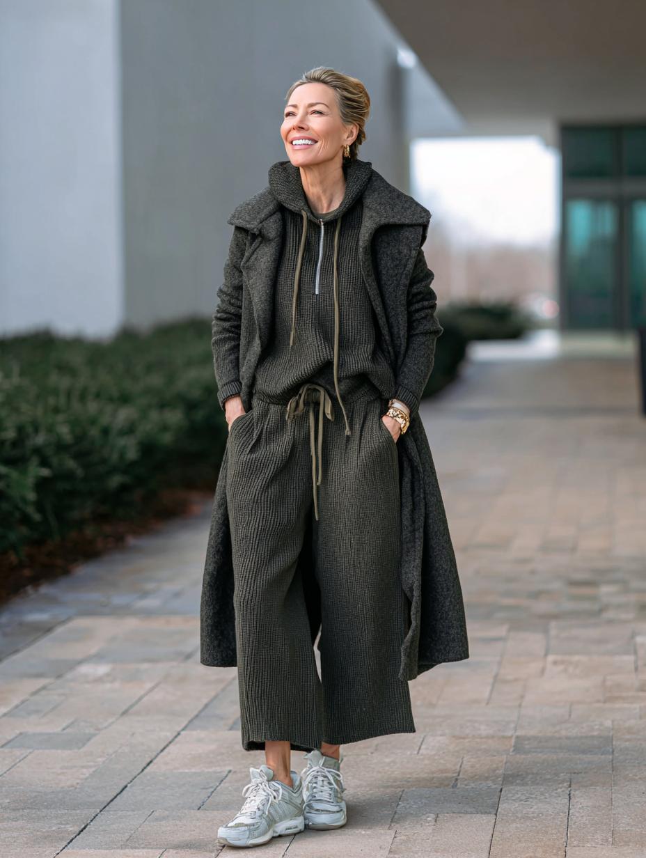 Olive green ribbed knitwear transforms casual comfort into refined elegance when paired with a charcoal wool coat. The matching hoodie and wide-leg trouser set creates a cohesive monochromatic foundation, while metallic sneakers add an unexpected luxurious twist. This effortless combination proves that athleisure can be both polished and practical for sophisticated women.