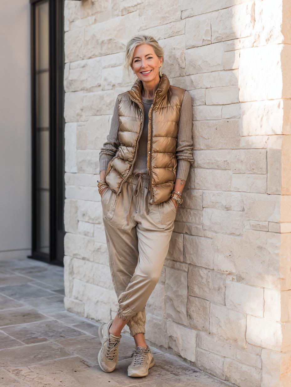 Monochromatic beige tones create sophisticated harmony in this elevated athleisure ensemble. The puffer vest adds modern texture while maintaining clean lines, perfectly complemented by matching joggers and ribbed knit layers. Gold jewelry provides subtle luxury touches, while neutral sneakers complete the refined sporty aesthetic that transitions seamlessly from morning errands to casual lunch dates.