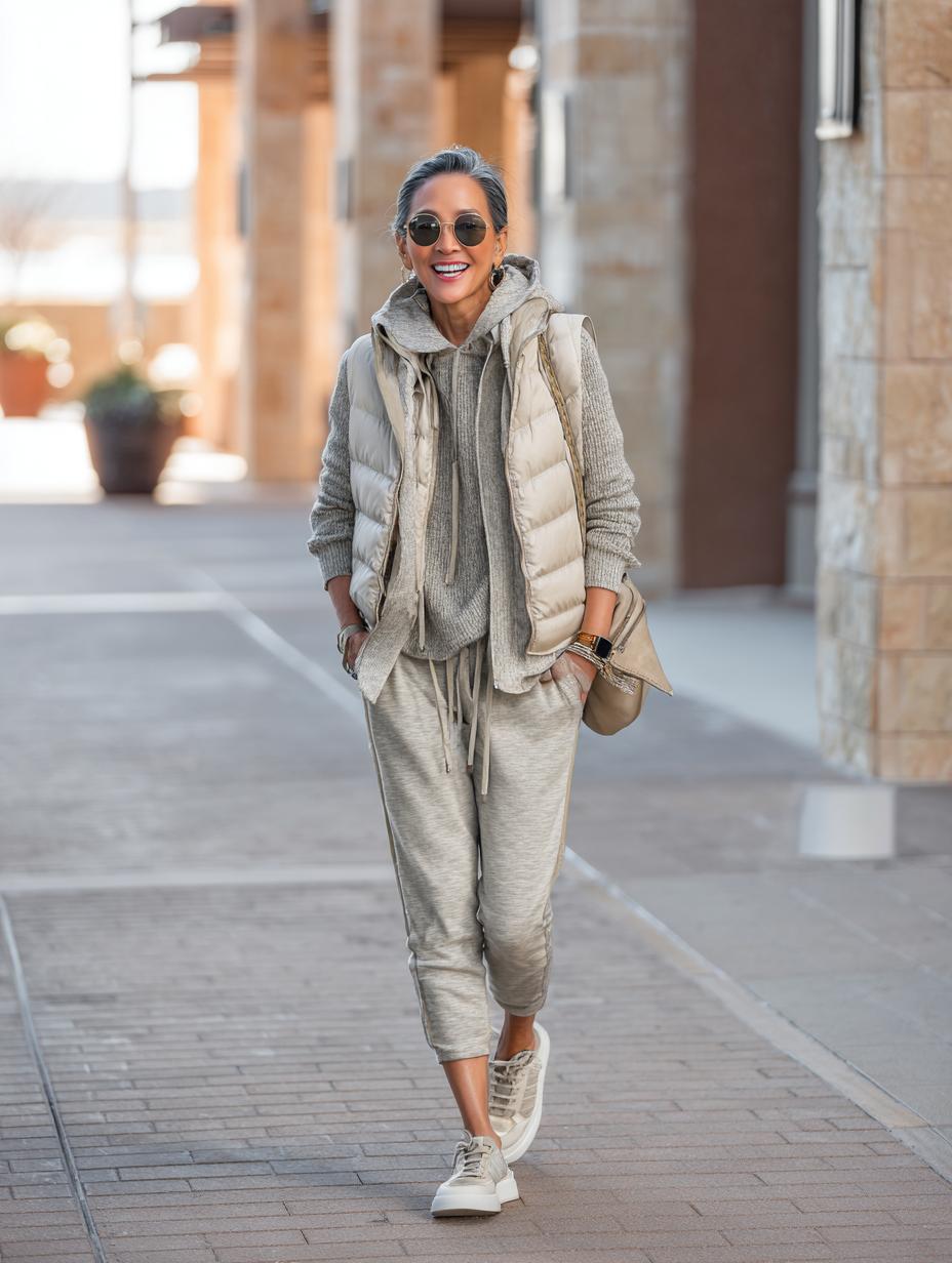 Heather gray coordinates create a sophisticated foundation that transitions seamlessly from coffee runs to casual meetings. Layer a cream puffer vest over matching knit separates for instant polish, while neutral sneakers ground the look in comfort. Round sunglasses and delicate jewelry elevate the athleisure aesthetic into luxury territory perfect for discerning women.