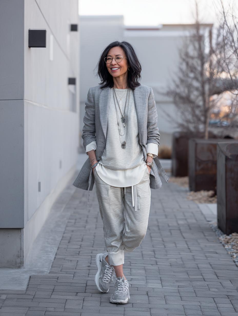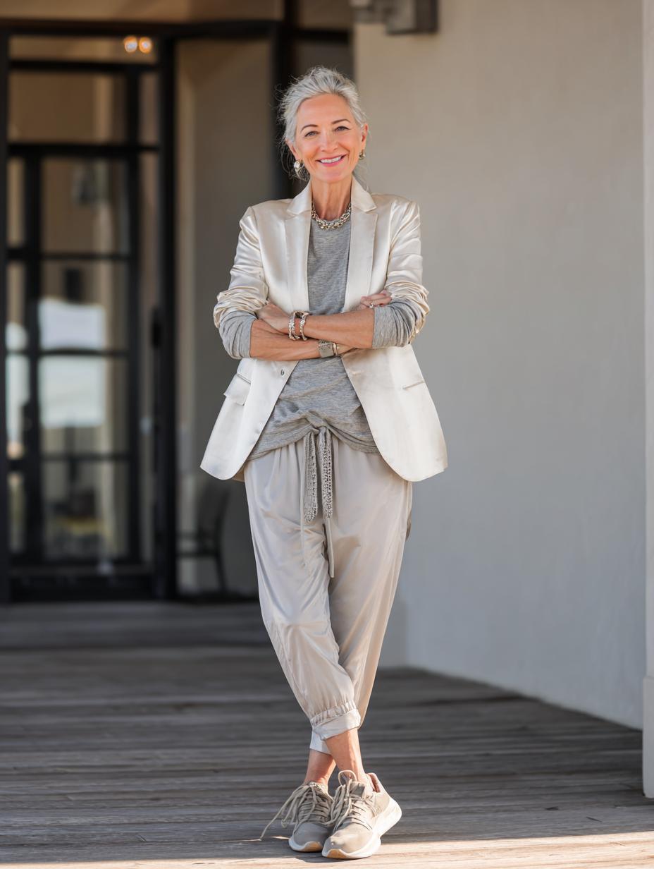 Cream linen blazer transforms casual athleisure into refined elegance when paired with matching joggers and sneakers. Pearl statement necklace adds luxurious sophistication while maintaining the effortless vibe. Silver hair styled in a relaxed updo completes this polished yet comfortable look. Perfect for coffee dates, casual meetings, or weekend errands when you want to look put-together without sacrificing comfort.