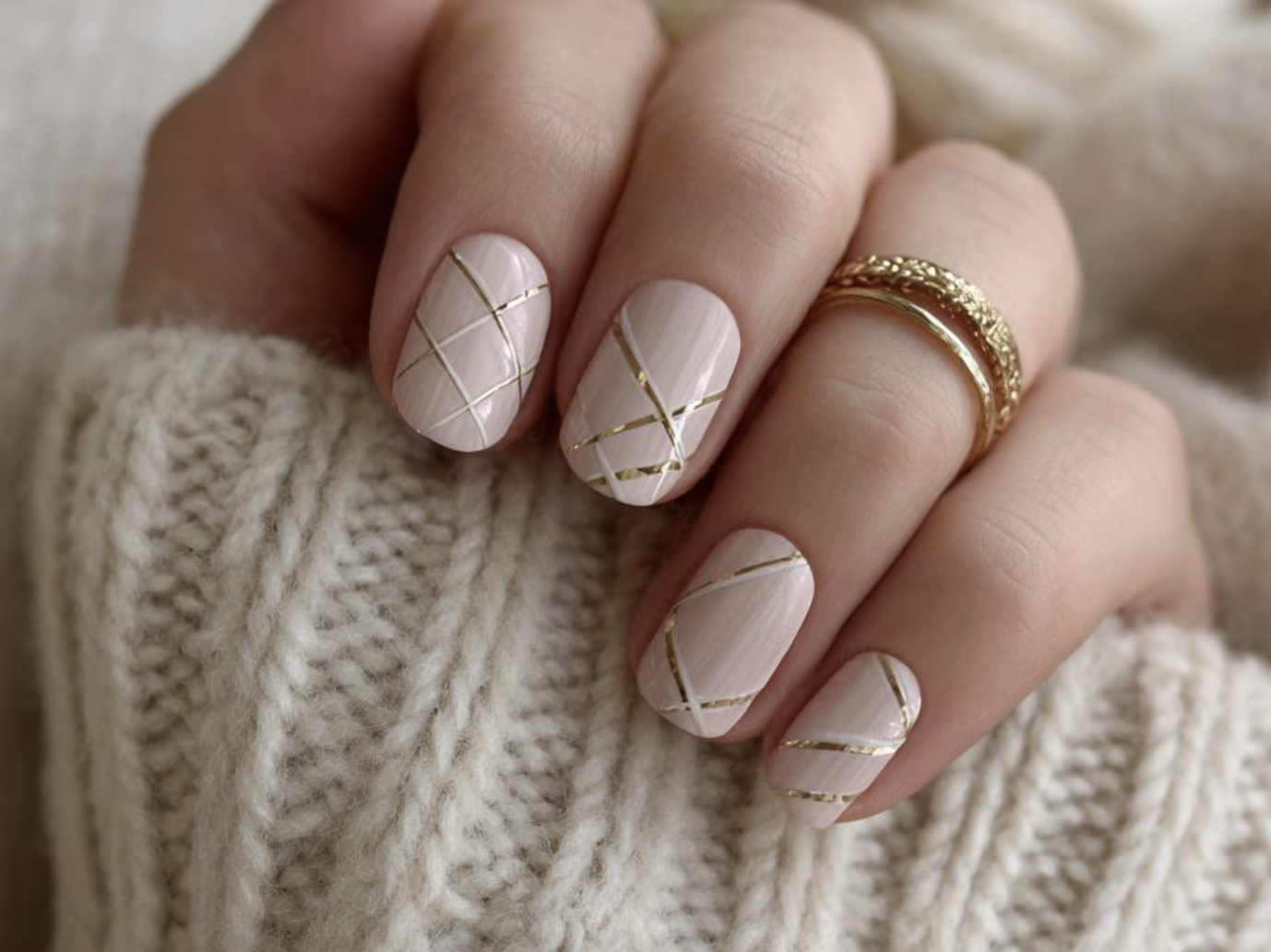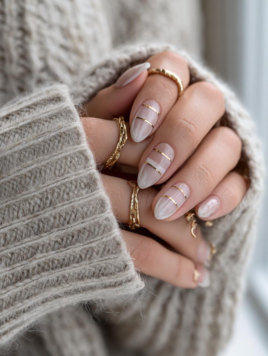 This understated nail design epitomizes quiet luxury with its soft nude base and delicate gold metallic stripes. The almond-shaped nails feature translucent pink polish with precisely placed horizontal gold lines that create an elegant geometric pattern. This sophisticated manicure pairs beautifully with layered gold jewelry and cozy neutral knitwear, making it perfect for those who prefer refined, minimalist beauty looks that whisper rather than shout.