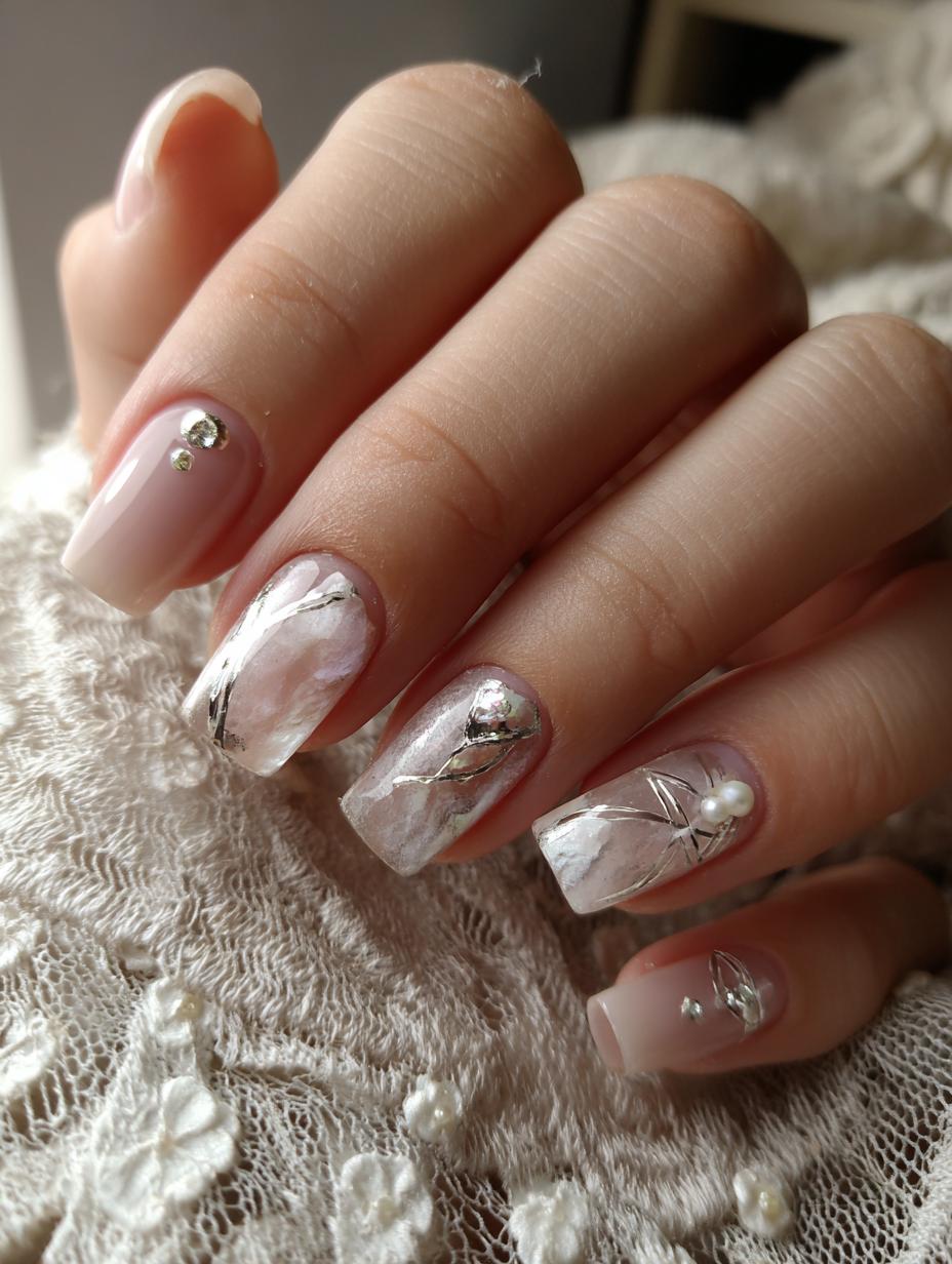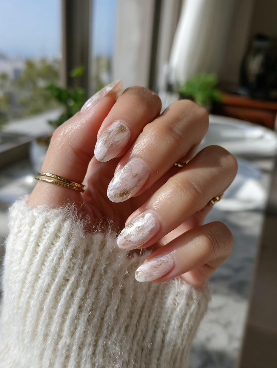 This sophisticated nail design features a dreamy marble effect in soft nude and white tones, elevated with delicate gold foil accents. The translucent base creates an ethereal, cloud-like appearance that’s perfect for the quiet luxury aesthetic. This understated yet elegant manicure pairs beautifully with minimalist jewelry and neutral tones, making it ideal for both professional settings and special occasions.