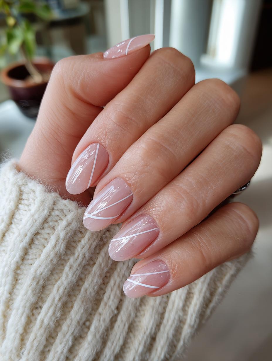 These elegant nude pink nails feature delicate white diagonal line details that epitomize the quiet luxury trend. The subtle geometric pattern adds visual interest without being overwhelming, while the glossy finish and perfectly shaped oval nails create a sophisticated, polished look that’s perfect for any occasion.