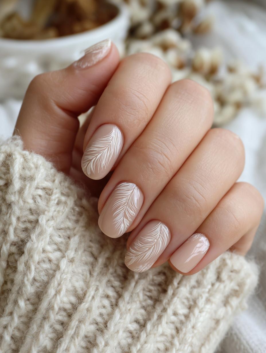 Delicate Feather Nail Art in Nude Tones