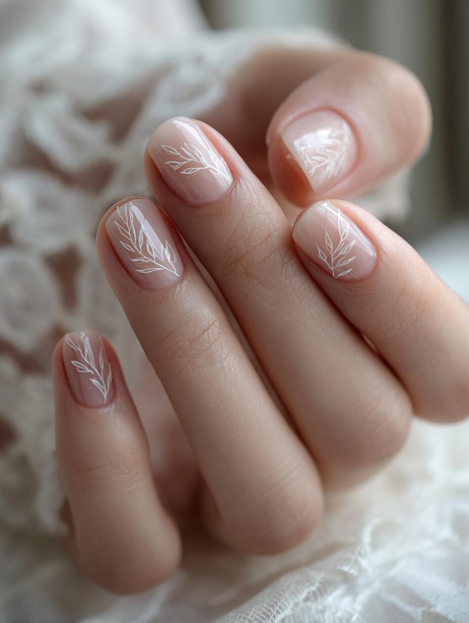 This ethereal manicure showcases the epitome of quiet luxury with its barely-there nude base and intricate white botanical line art. Each nail features delicate hand-drawn leaves and branches that appear to dance across the natural pink undertones, creating an understated yet sophisticated look. The translucent finish and minimalist botanical motifs make this the perfect choice for brides, professionals, or anyone seeking refined elegance that whispers rather than shouts.